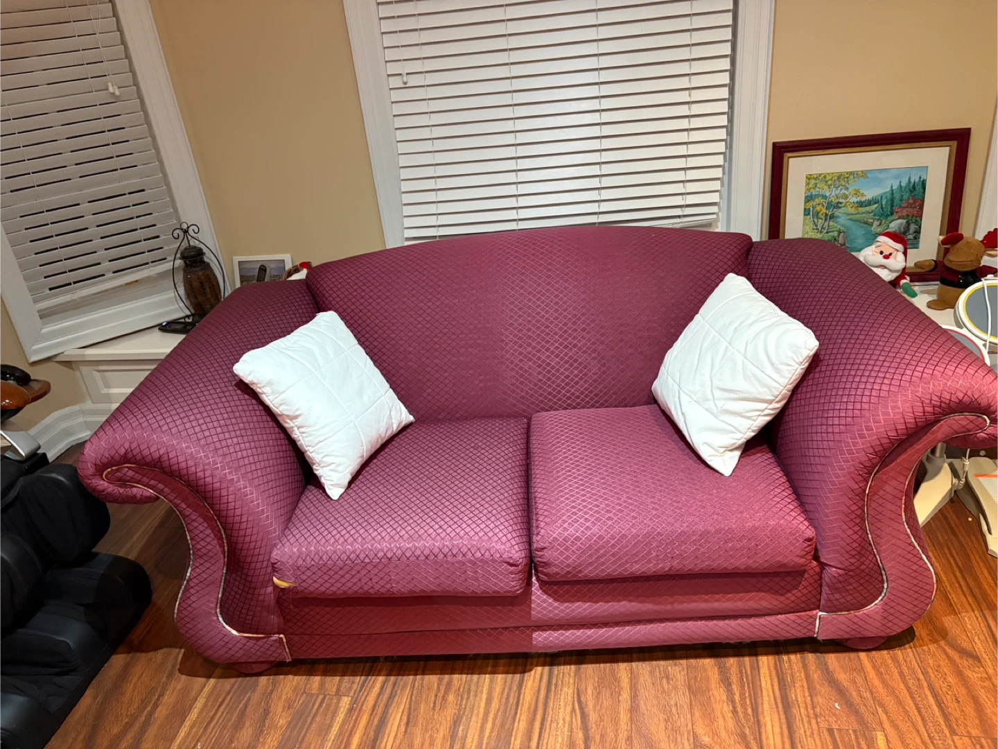 Here's a comfy sofa and loveseat combo ( burgundy) - in a reddish-pink colour! It's a great piece for any living room or den. It has a unique textured pattern that adds a touch of elegance. Very strong frame . Very durable. Will last a long time. Solid construction.