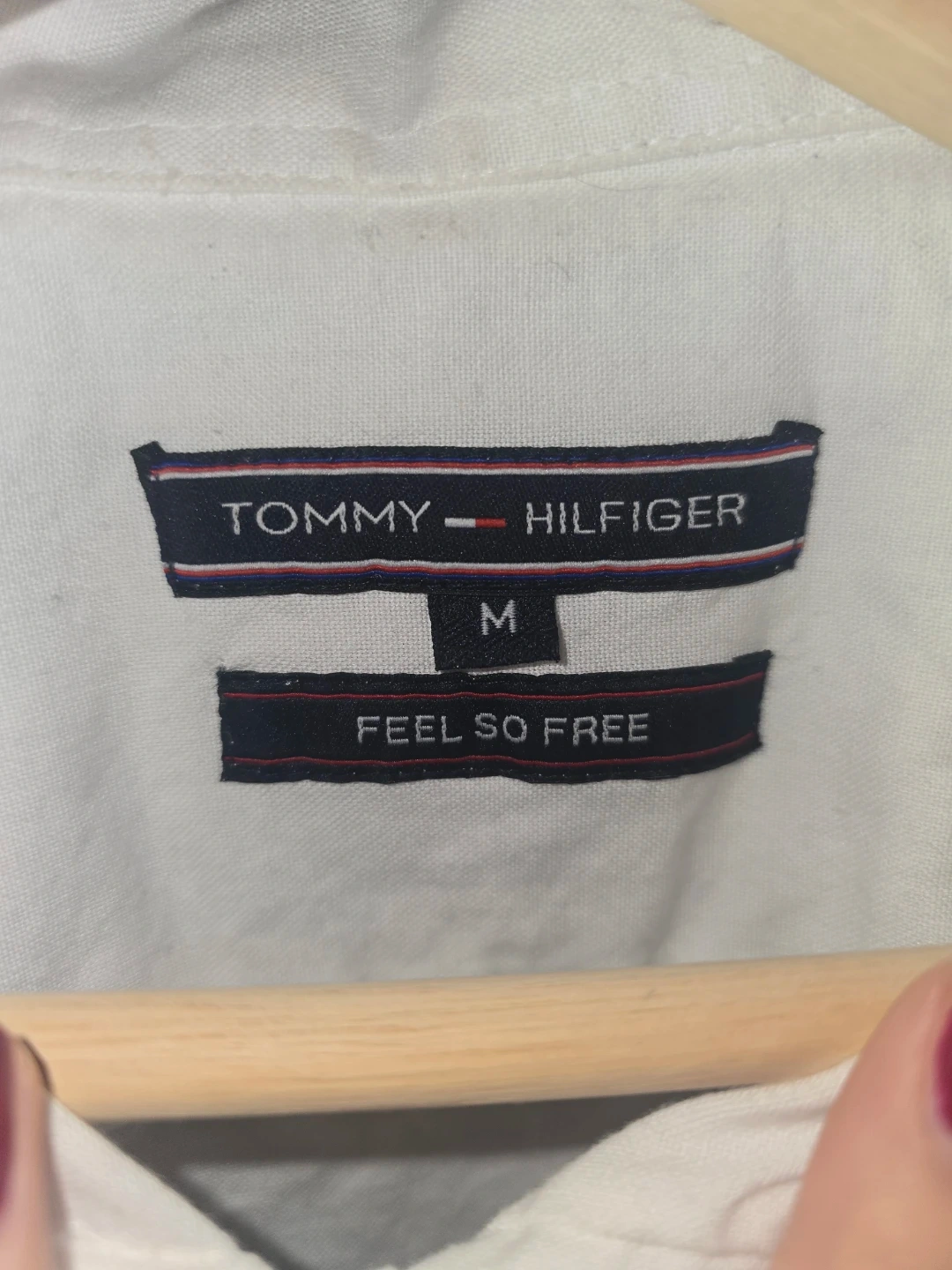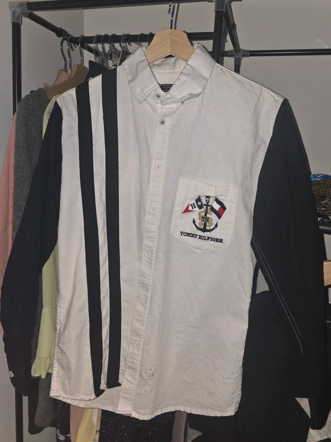 Tommy Hilfiger button-up shirt. White with black sleeves and striped accents. Size medium. 'Feel So Free' tag on inside. Not sure if it's men's or women's