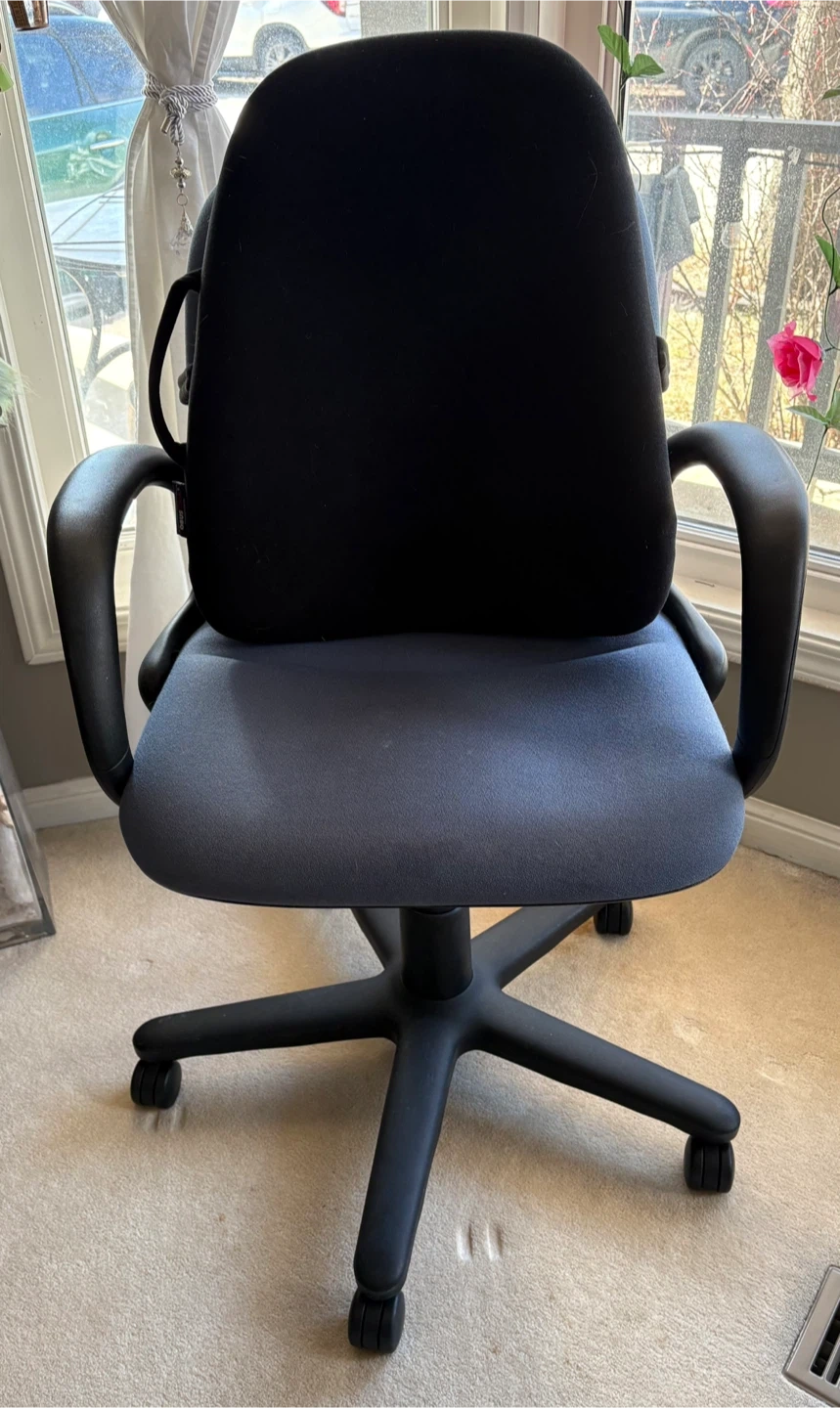 This is a standard blue office chair with adjustable height. It features a padded seat and backrest for comfort. The five-star base with casters allows for easy mobility. This chair is great for a home office or workspace.