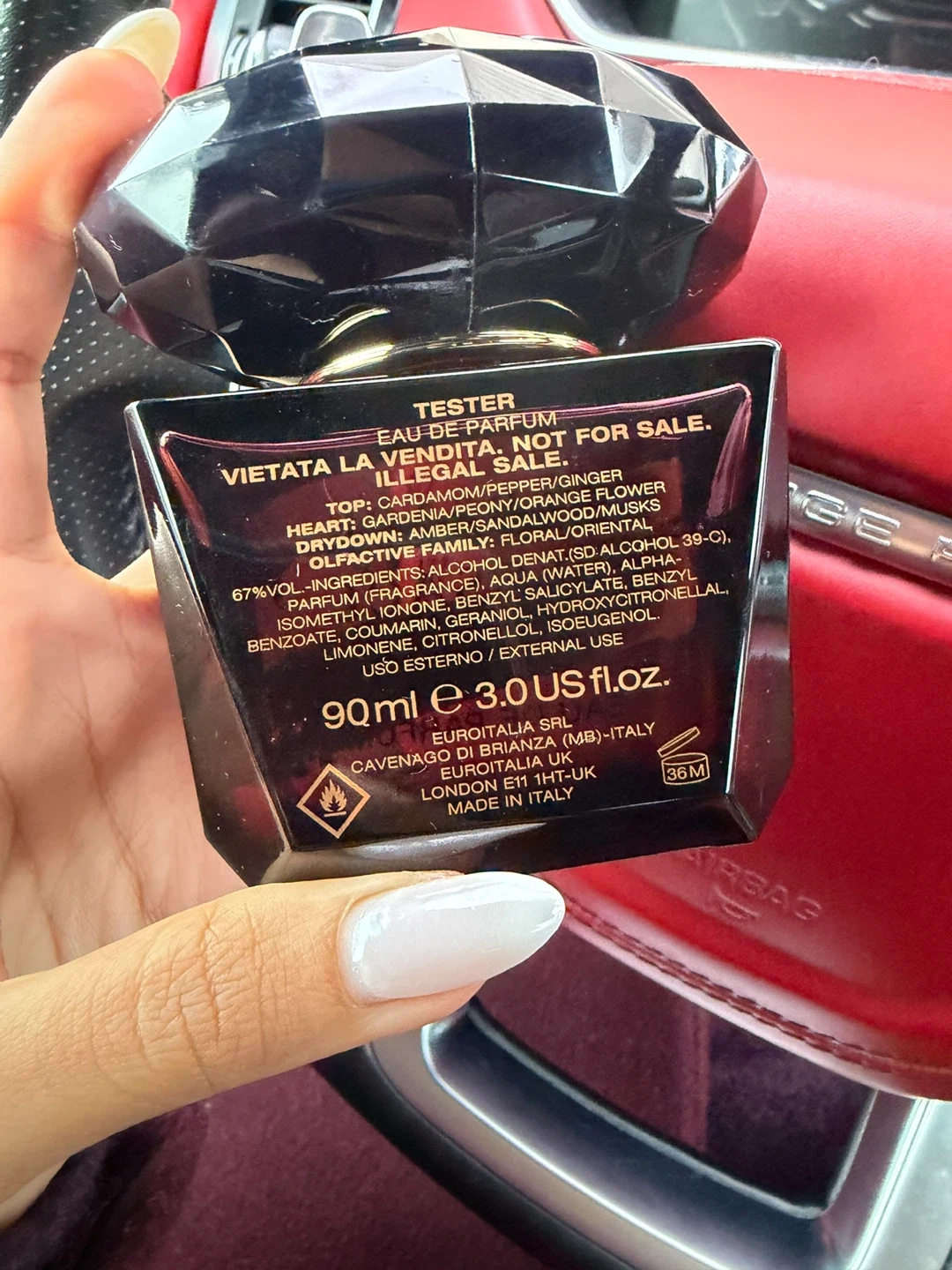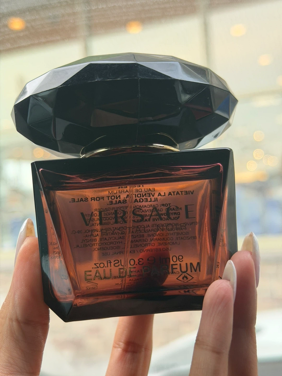 This is Versace Crystal Noir Eau de Parfum. It's a 90ml bottle. The scent has top notes of gardenia, peony, and orange blossom, with heart notes of cardamom, jasmine, and sandalwood, and base notes of amber, musk, and iris.