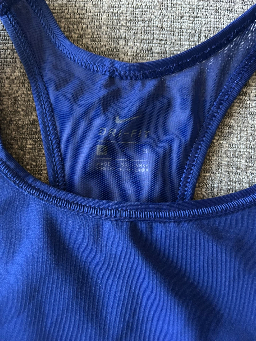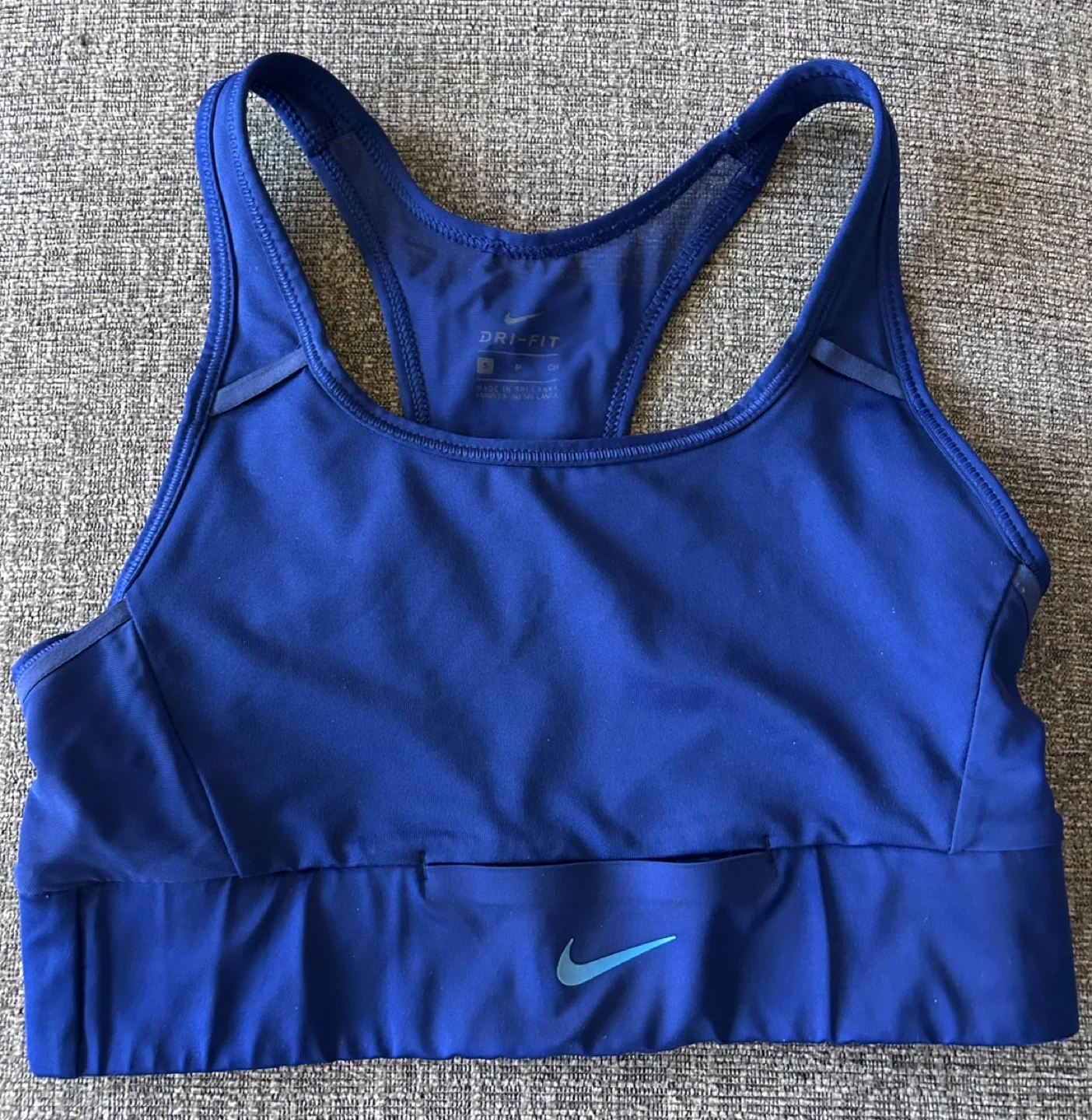 This is a Nike Dri-FIT sports bra in blue. It's made with Dri-FIT fabric to help keep you dry. Size Small. It is high impact perfect for cardio workouts. Only worn a handful of times. Has been washed and cleaned. It is a racerback style.