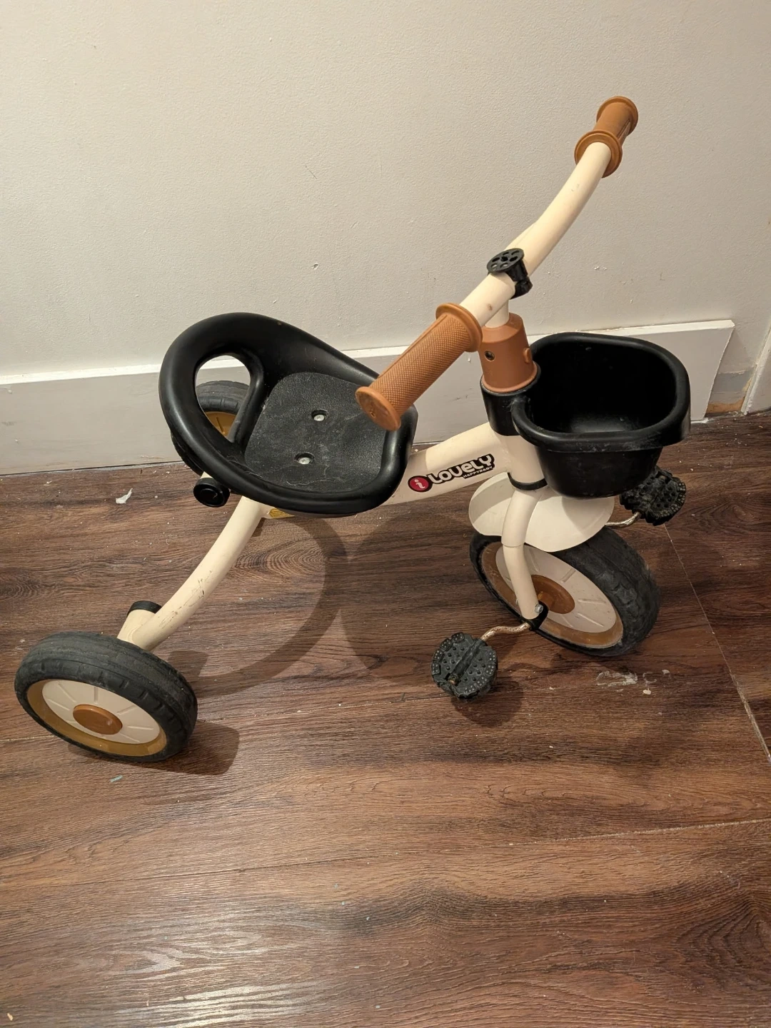 This is an i LOVELY tricycle in cream and black. It has a front basket for carrying small items. Suitable for toddlers learning to ride.