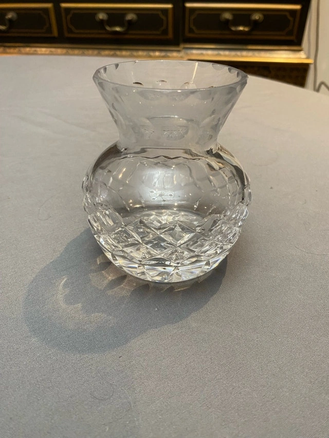 This Vintage Cartier Signed Hand Cut Crystal Bud Vase stands at 3.5 inches tall with a diamond pattern design, making it a stunning decorative piece for any space. Crafted with precision and elegance in France, this original piece is signed by Cartier, guaranteeing its authenticity and quality. The vase features a glossy finish and hand-blown production technique, adding to its unique and contemporary style. Weighing 13.7 ounces, this clear crystal vase brings sophistication and luxury to any room, making it a timeless addition to any collection. It dates to the late 20th century. It measures 3.5 tall and 3 wide. It is in mint condition with no chips or damage. It weighs 13.7 ounces.