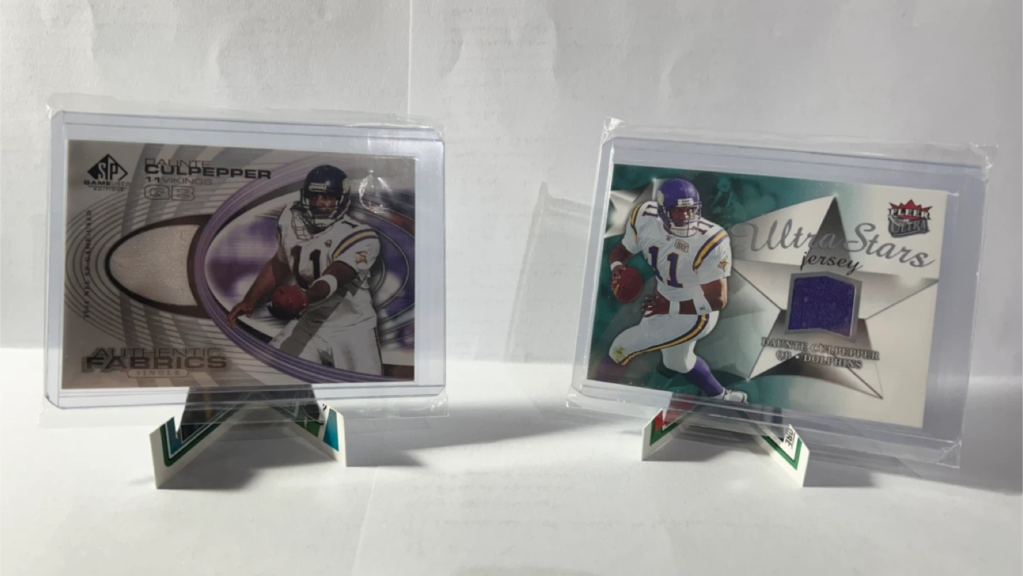 Two Daunte Culpepper football cards featuring game-used jersey pieces. One is from SP Authentic Fabrics and the other is from Fleer Ultra Stars. Both cards showcase jersey material patches.