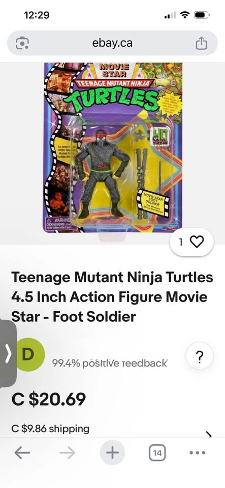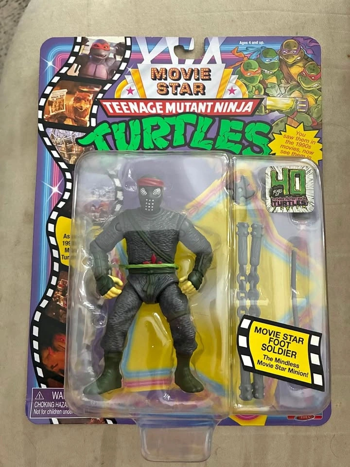 Teenage Mutant Ninja Turtles Movie Star Foot Soldier by Playmates Toys. Approximately 4 inches tall. Authentically detailed to match the 1990s movie appearance, fully poseable, and includes signature weapon accessories. Blister card packaging with classic "Movie Star" graphics. Card is in good condition with a small crease on the bottom left (see photo). Sells for $20 plus on line (see attached photo).