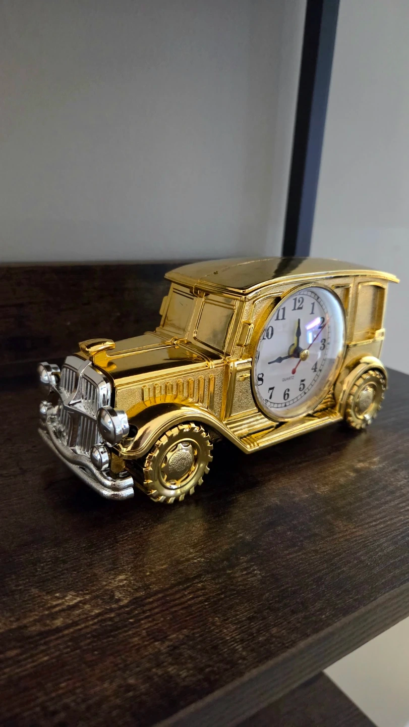 This unique alarm clock is designed to look like a vintage jeep. It is brand new and never been used. It features a construction with intricate detailing. The clock face is easy to read and it's powered by a quartz movement. It's a fun decorative piece for any desk or shelf! It has two knots – one to set the time, the other to set the alarm clock. Please don't ask for a lower price.