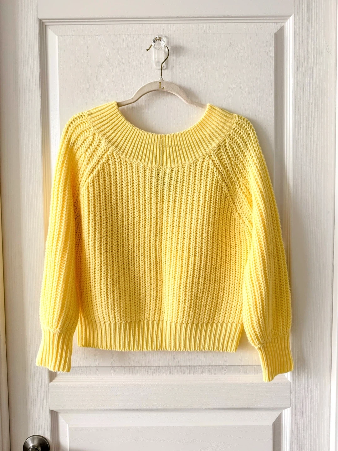 A lovely yellow knit sweater in size L. It’s in great condition and ready to keep you warm and stylish!