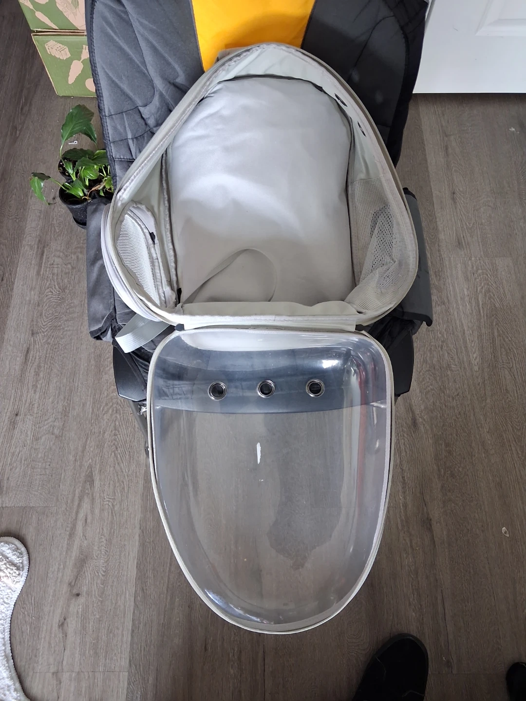 This bubble backpack carrier is designed for pets. It has a clear dome for your pet to see out and ventilation holes for airflow. Includes a mesh cover and a soft interior pad.