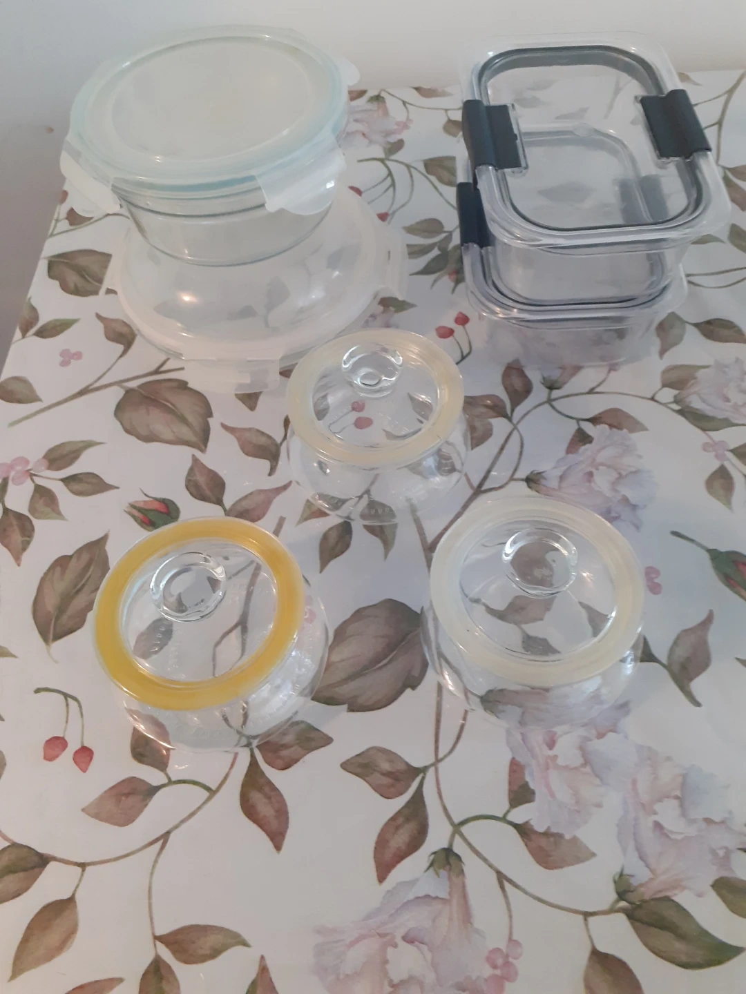 Set of glass food storage containers with plastic lids. Includes various round and rectangular sizes. Great for meal prep and leftovers!