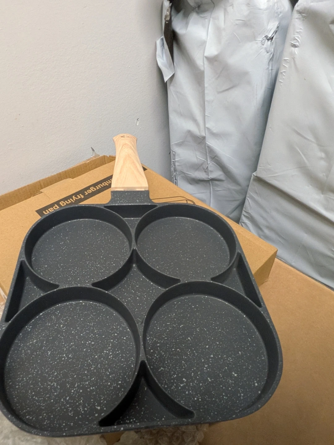 This frying pan has four individual cups, perfect for cooking multiple eggs or small patties at once. It features a non-stick surface for easy cooking and cleanup. Includes a wooden handle for a comfortable grip. Great for quick breakfasts or making sliders!