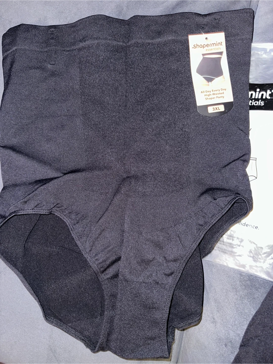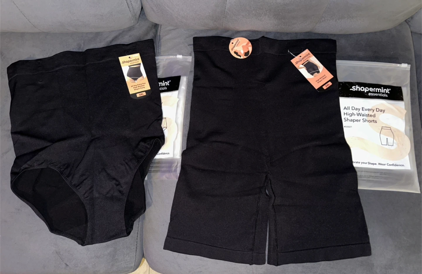 Includes one pair of Shapermint Essentials All Day Every Day High-Waisted Shaper Panty and one pair of High Waisted Shaper Shorts. Both are size 3XL. Brand new with tags, comes in original packaging with booklet and sheet of motivational stickers.