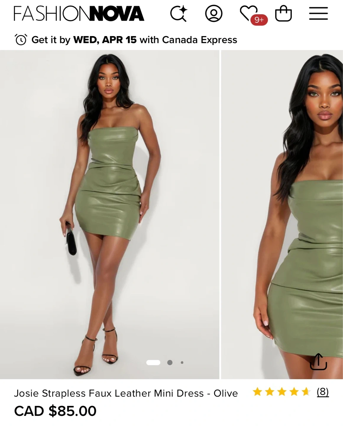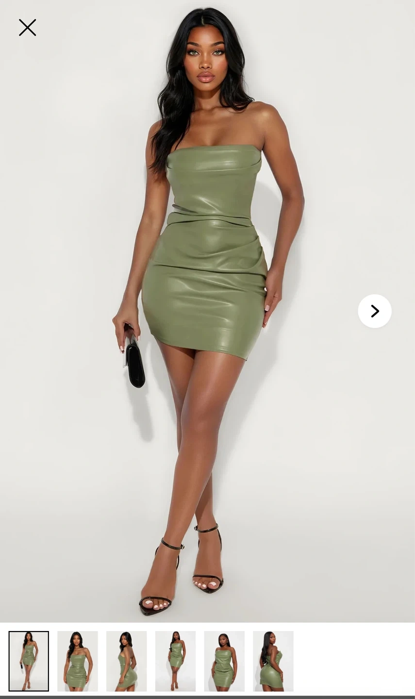 This is a strapless mini dress made from faux leather. It features a ruched detail on the bodice. A lovely olive green colour!