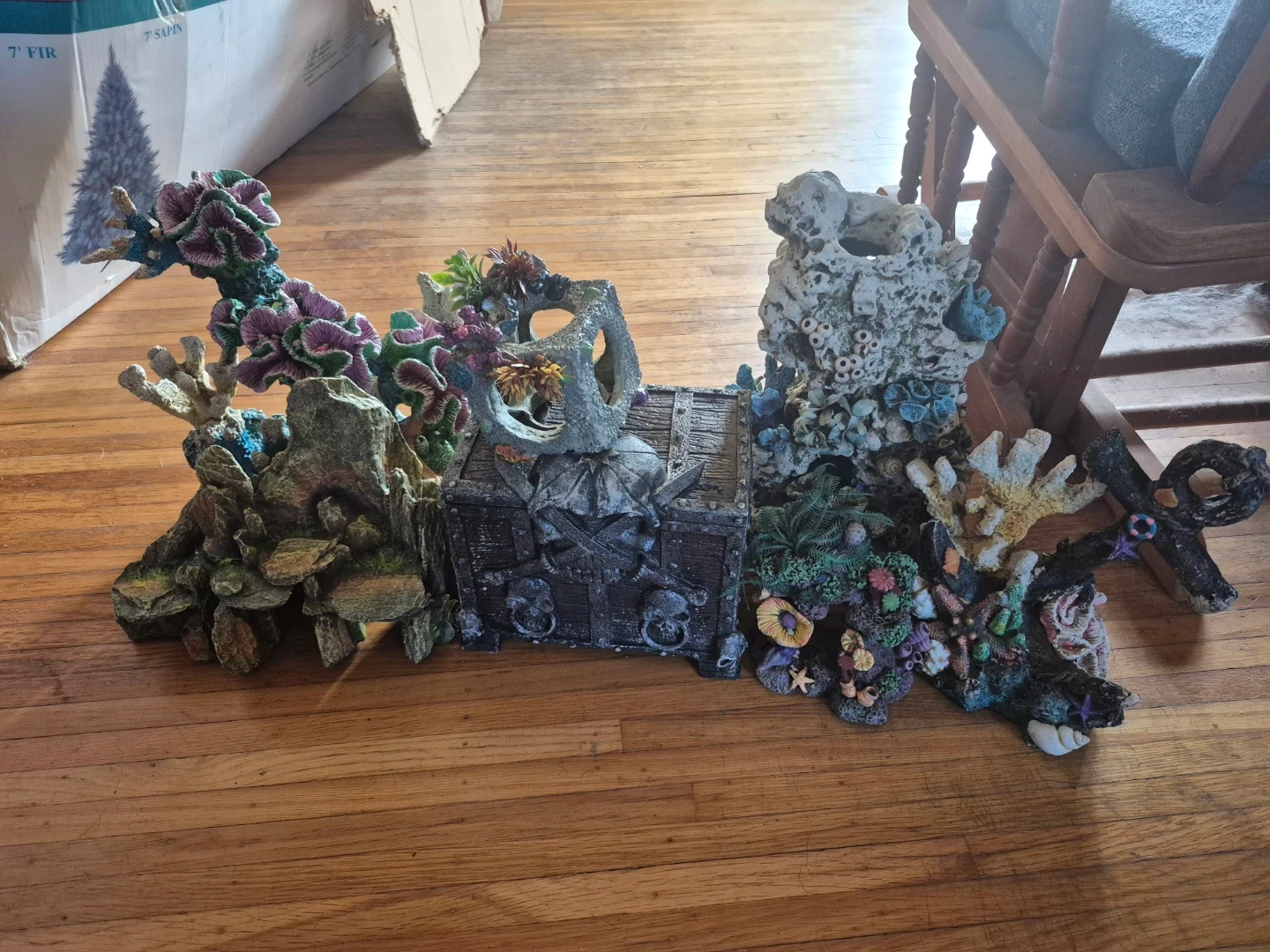 A collection of assorted aquarium decorations including a treasure chest, coral, rocks, and a tree stump with a frog. These pieces add visual interest to fish tanks. They're made from durable materials.