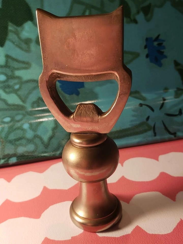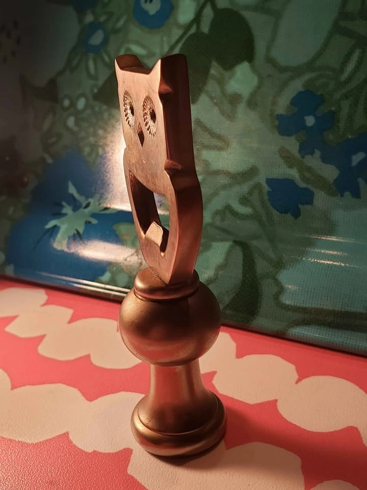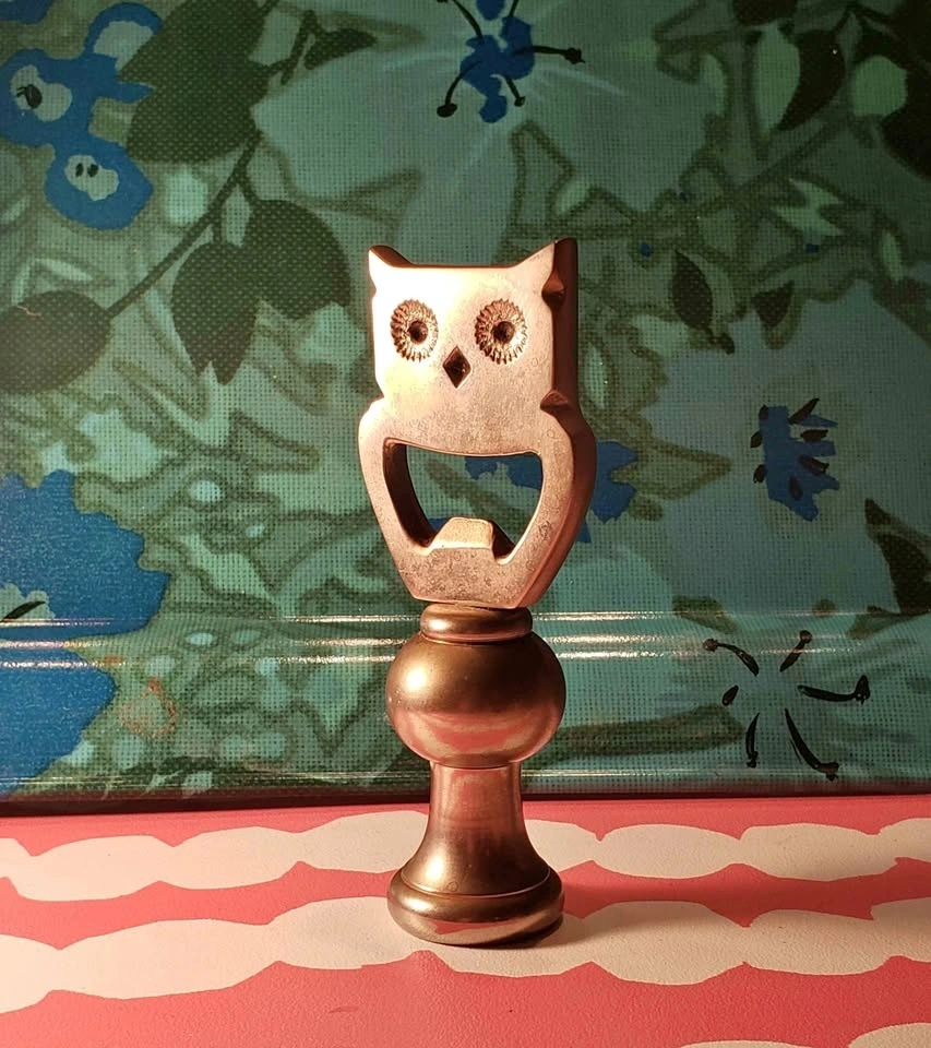 Solid brass owl bottle opener. Weighs about 275 grams. Bell shaped bottom with nice detail around the eyes. A pretty and unique vintage piece. Could make a cute gift or collectible for display. Pick up in Upper Lonsdale North Vancouver.