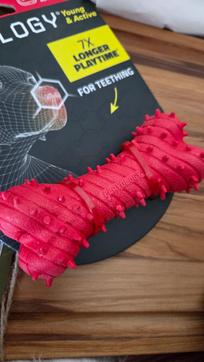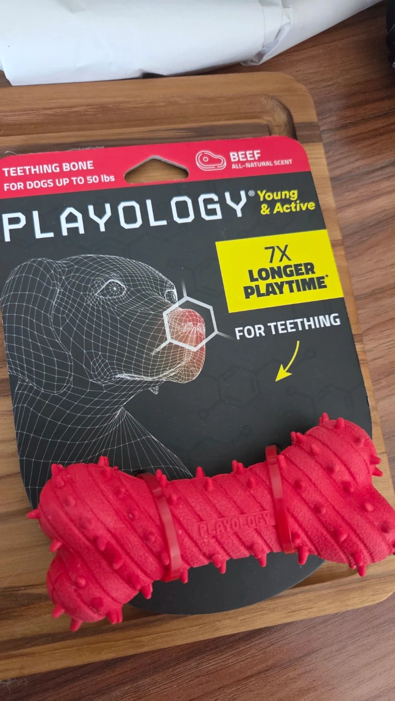 This is brand new. Very good for teething or hard-chewers. I understand the difficulty of having a dog whose chewing or playful habits need to be satisfied. This has a beef scent attractive to your dog, built with tough but safe material. Squeaker also inside, and your dog's happiness guaranteed. Please don't ask for a lower price, won't entertain such offer.