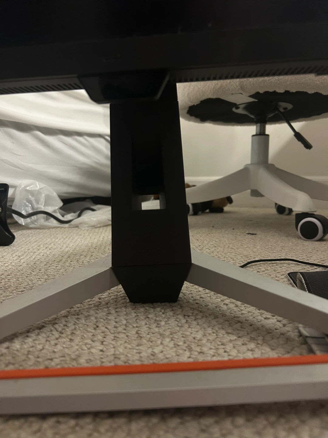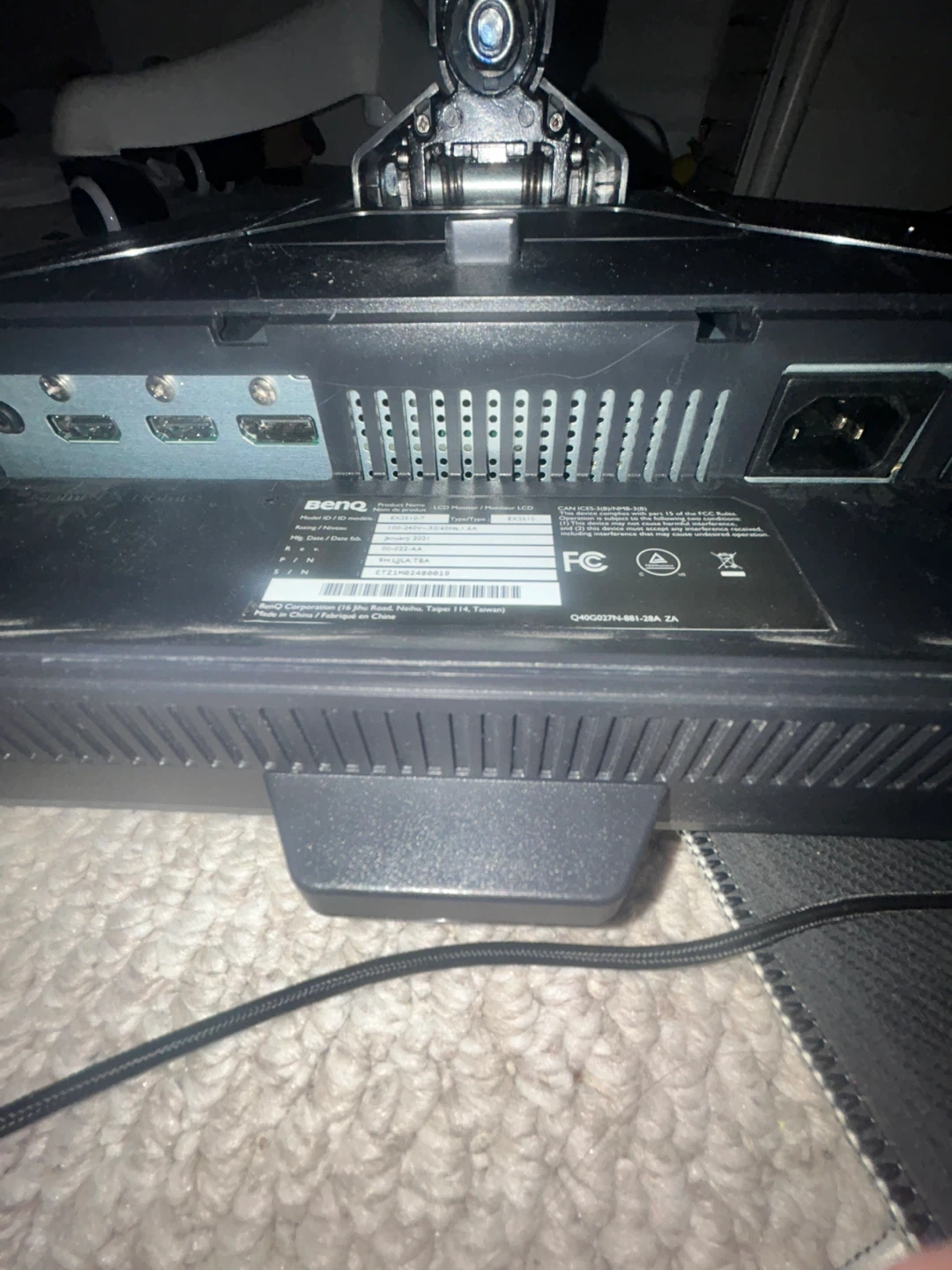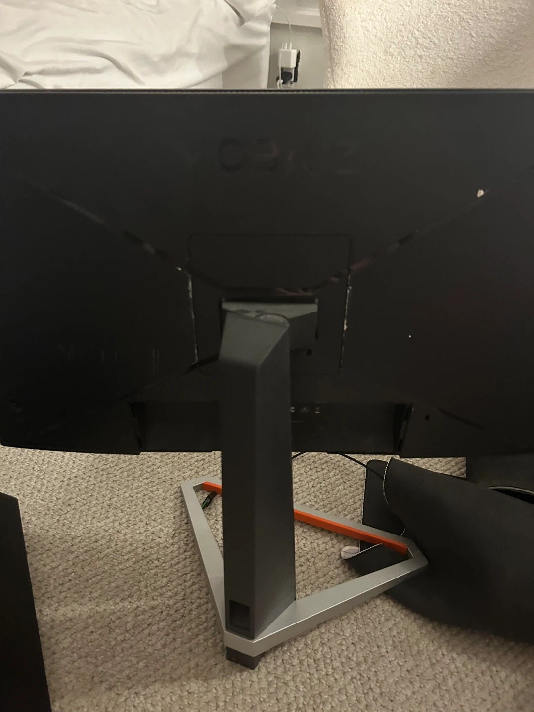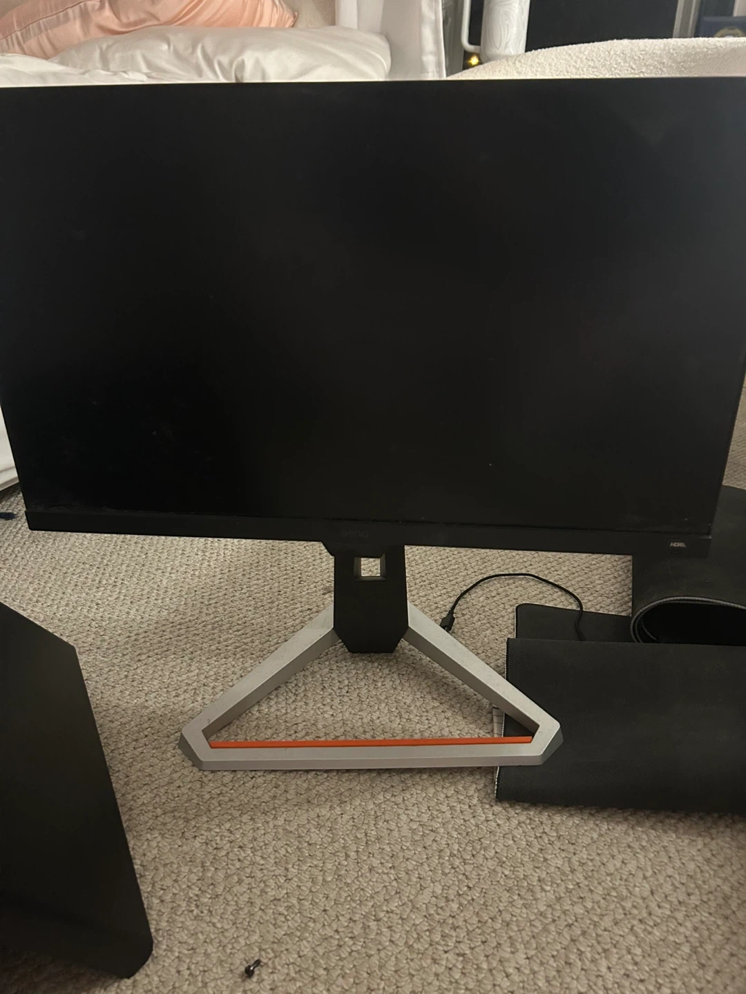 BenQ 27 inch gaming monitor. It's a great option for high refresh rate gaming. It has a sleek design with a grey and orange accent stand. Comes with necessary cables.