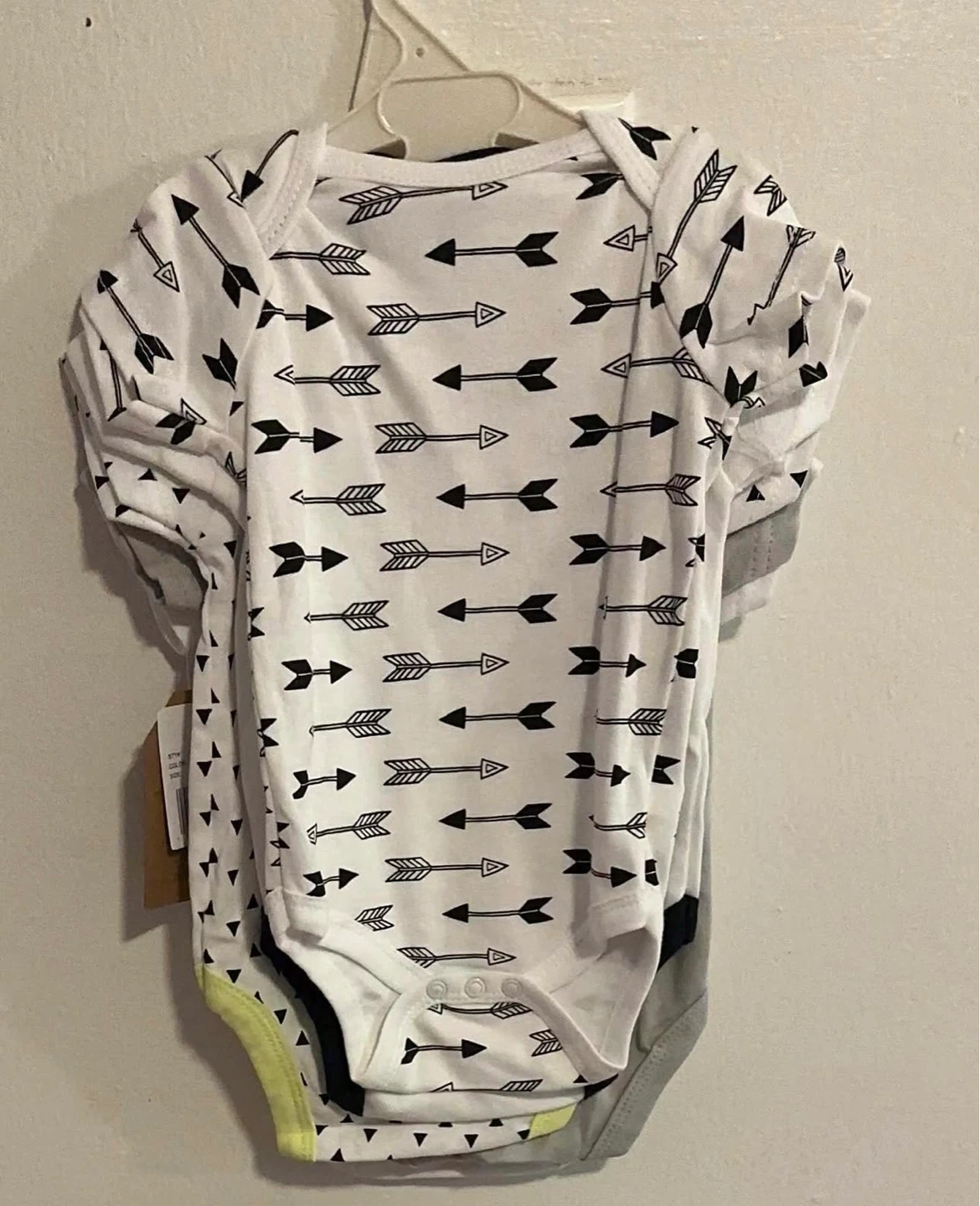 These Chick Pea brand bodysuits are designed for babies aged 0-3 months & 3-6 months, They feature short sleeves and come in a pack of five, showcasing various stylish designs including arrows and the fun slogan 'Watch Out I'm A Rebel'. These are new with tags and ready for your little one!