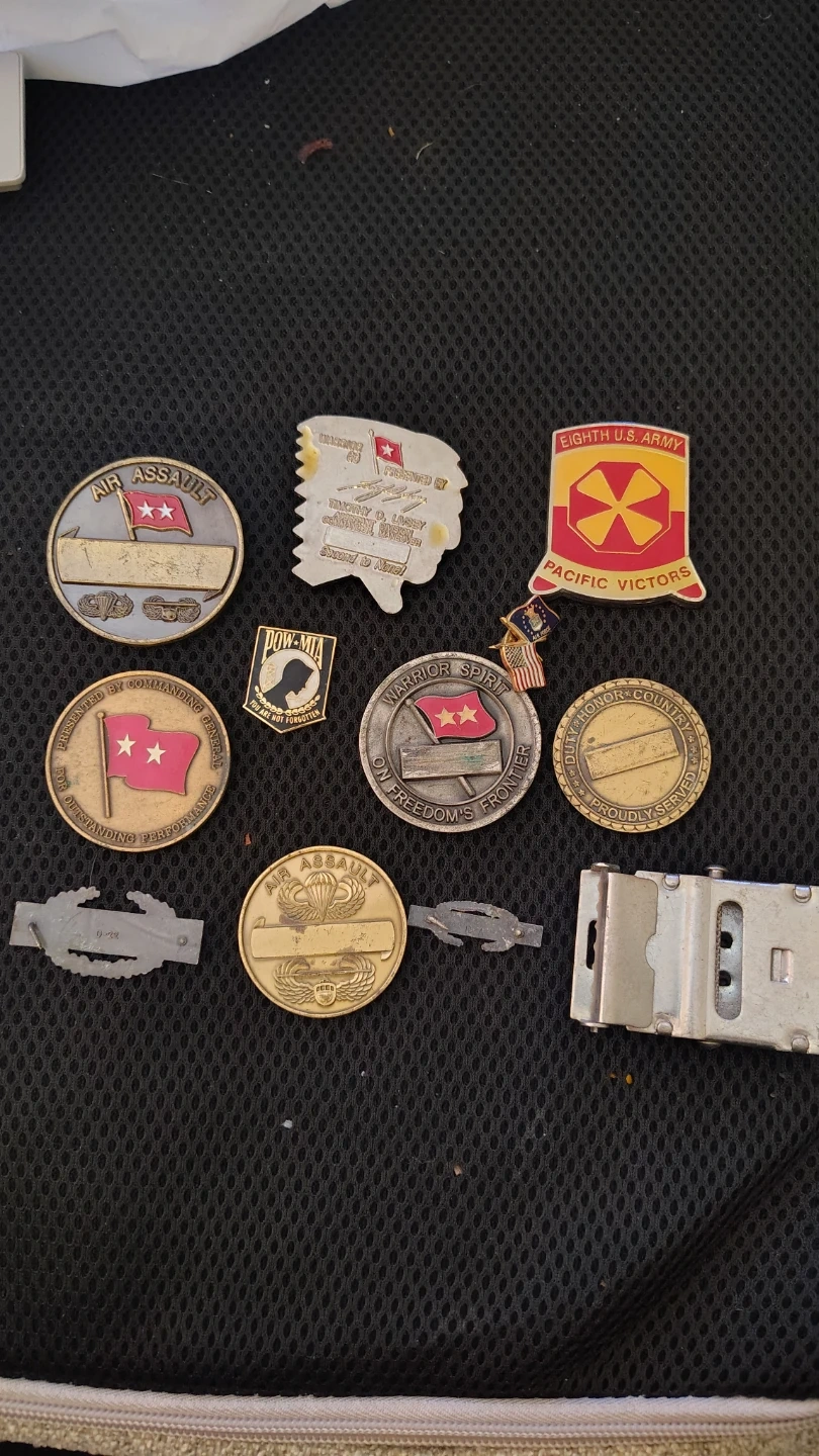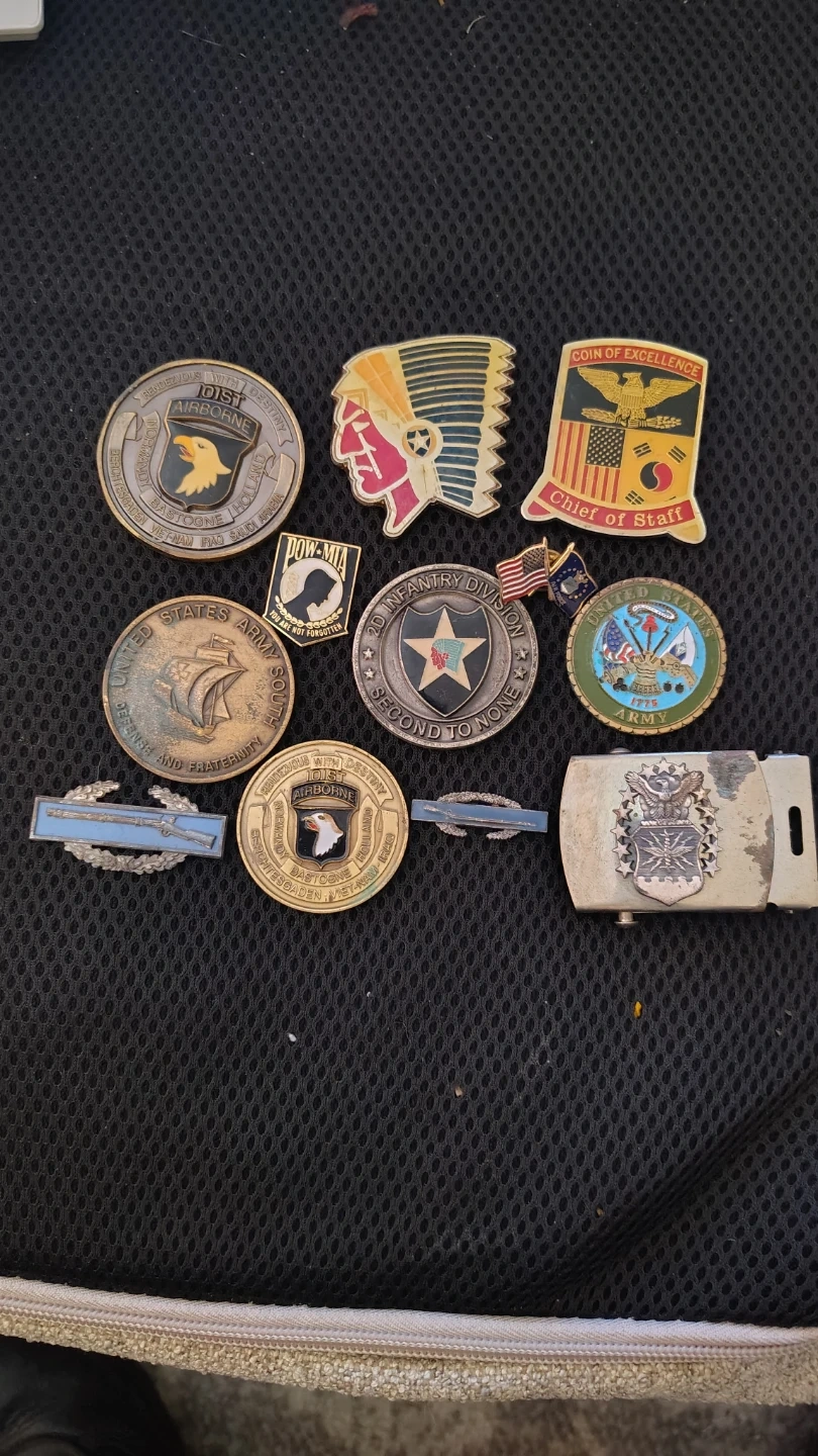 Collection of U.S. Army challenge coins and a belt buckle. Features various unit insignias and mottos. Items include Airborne, Air Assault, and Infantry division coins.