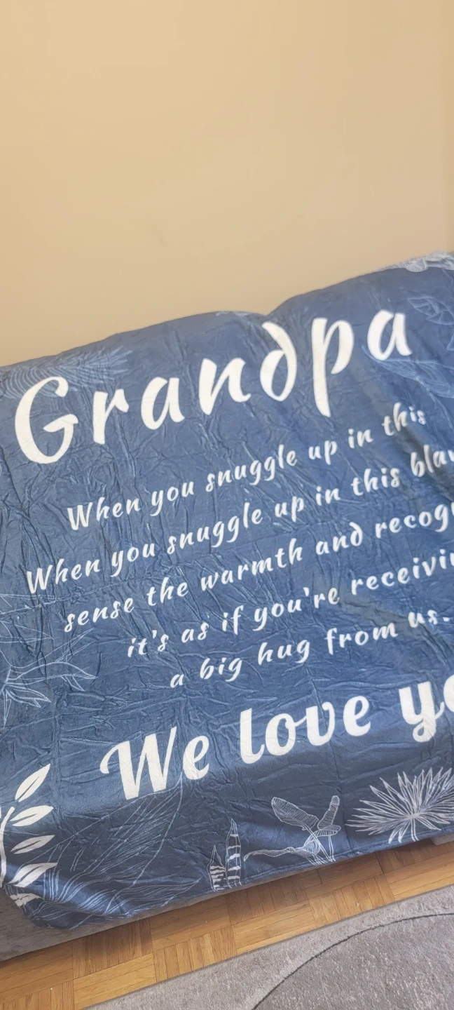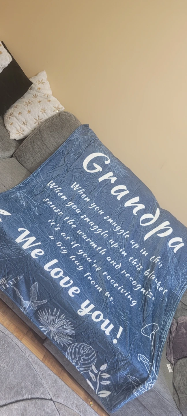 A blue throw blanket with a sentimental message for Grandpa. It reads, "When you snuggle up in this blanket sense the warmth and recognize it's as if you're receiving a big hug from us. We love you!". The design includes botanical prints and dragonflies. It's made of soft material perfect for cozying up.