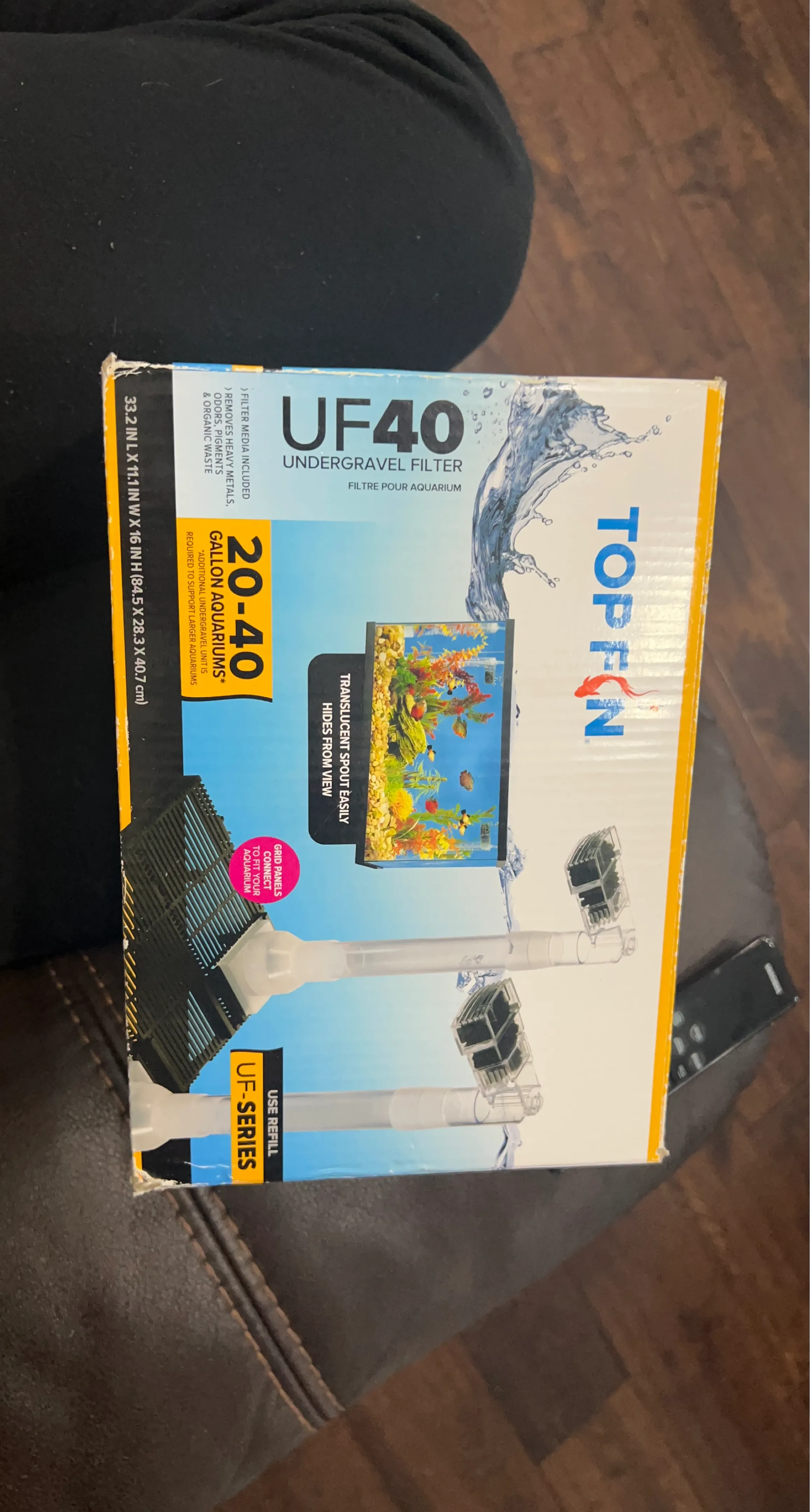 Top Fin UF40 undergravel filter for 20-40 gallon aquariums. It includes filter media that removes heavy metals, odors, pigments, and organic waste. The grid panels connect to fit your aquarium and the translucent spout hides from view.