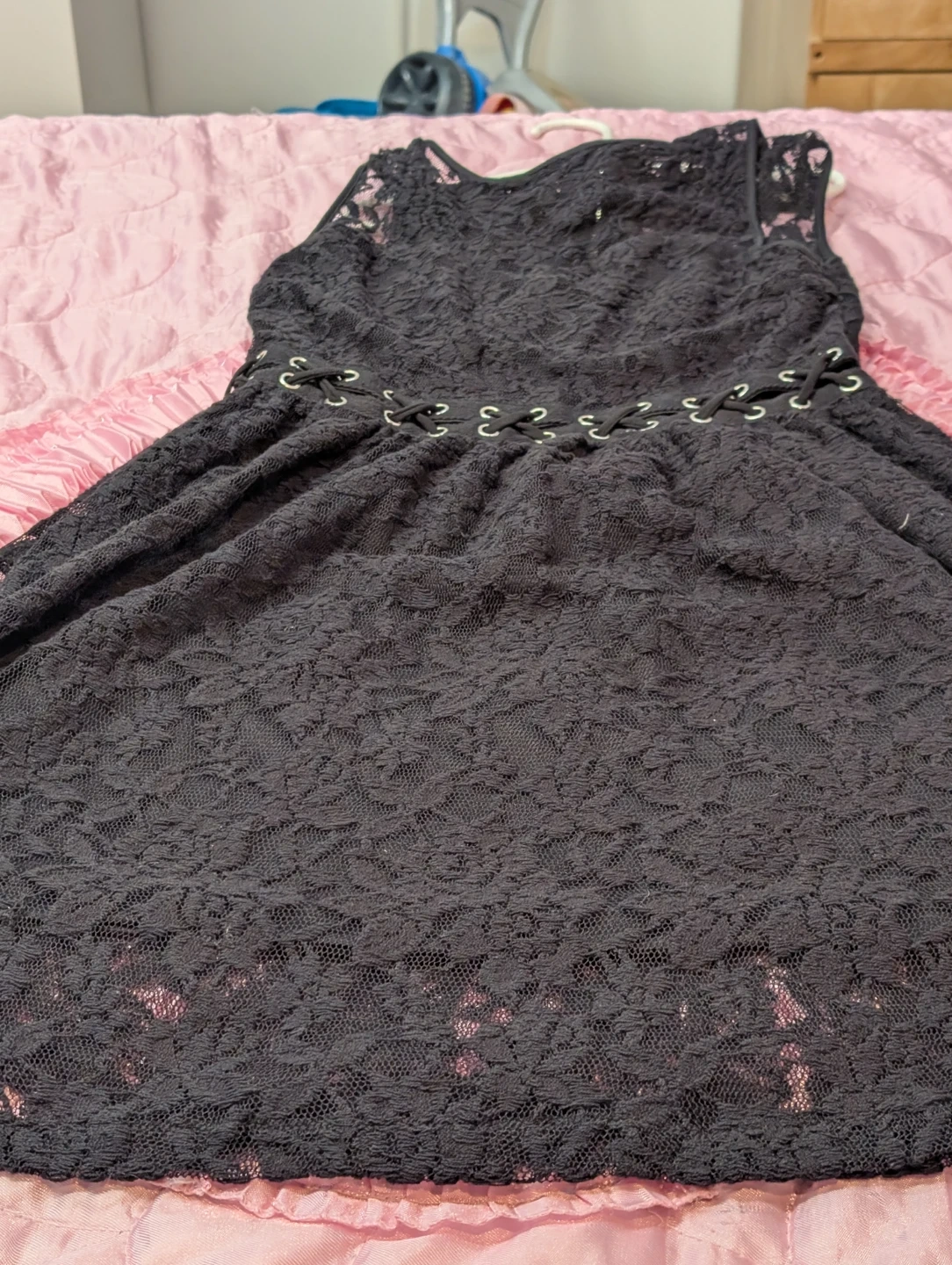 Bundle of five women's dresses. Includes a blue skater dress, a black lace dress with grommet detail, a navy sequined mini dress, a black floral print dress, and a cream lace-trimmed dress. Various styles and materials.