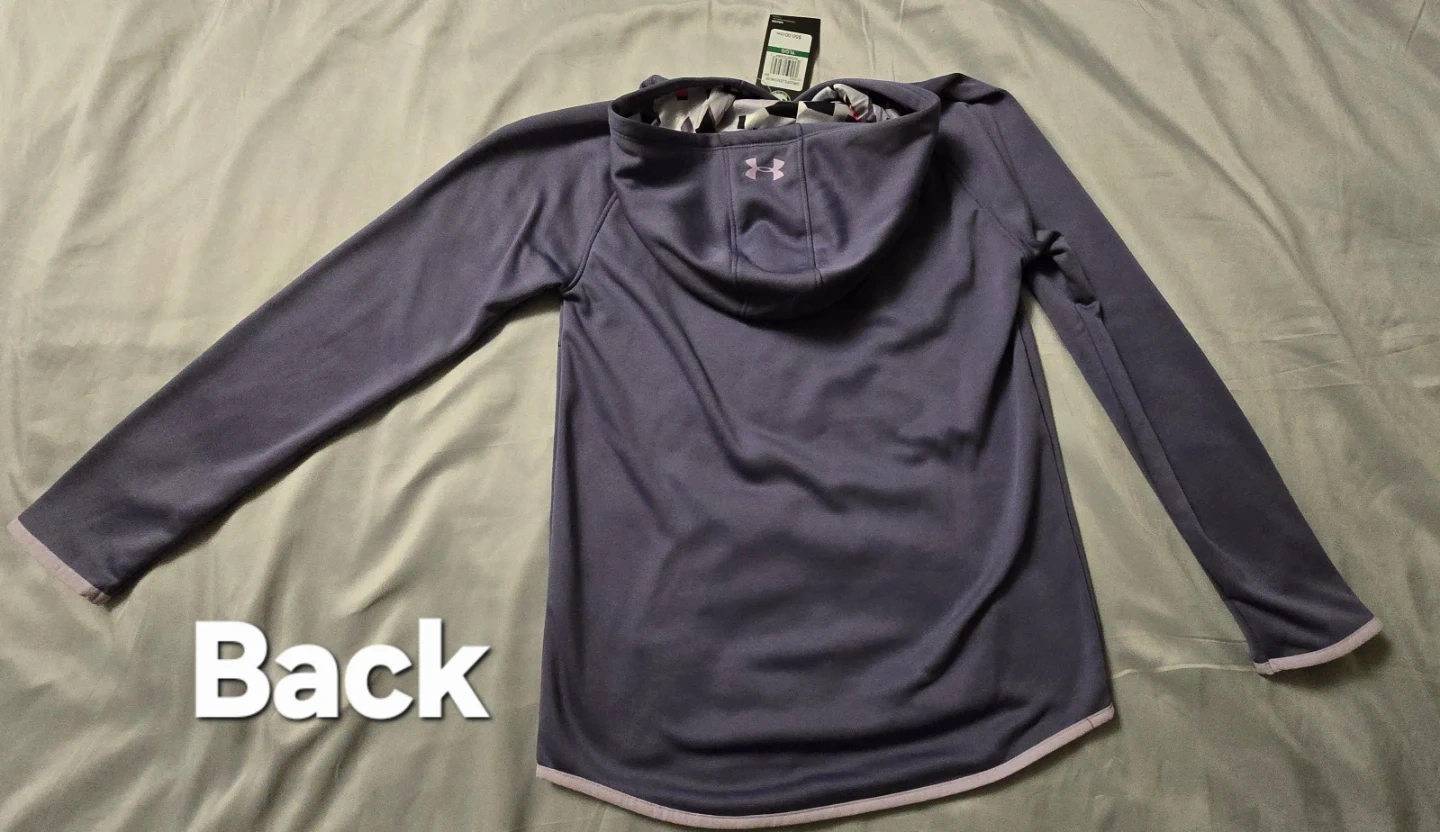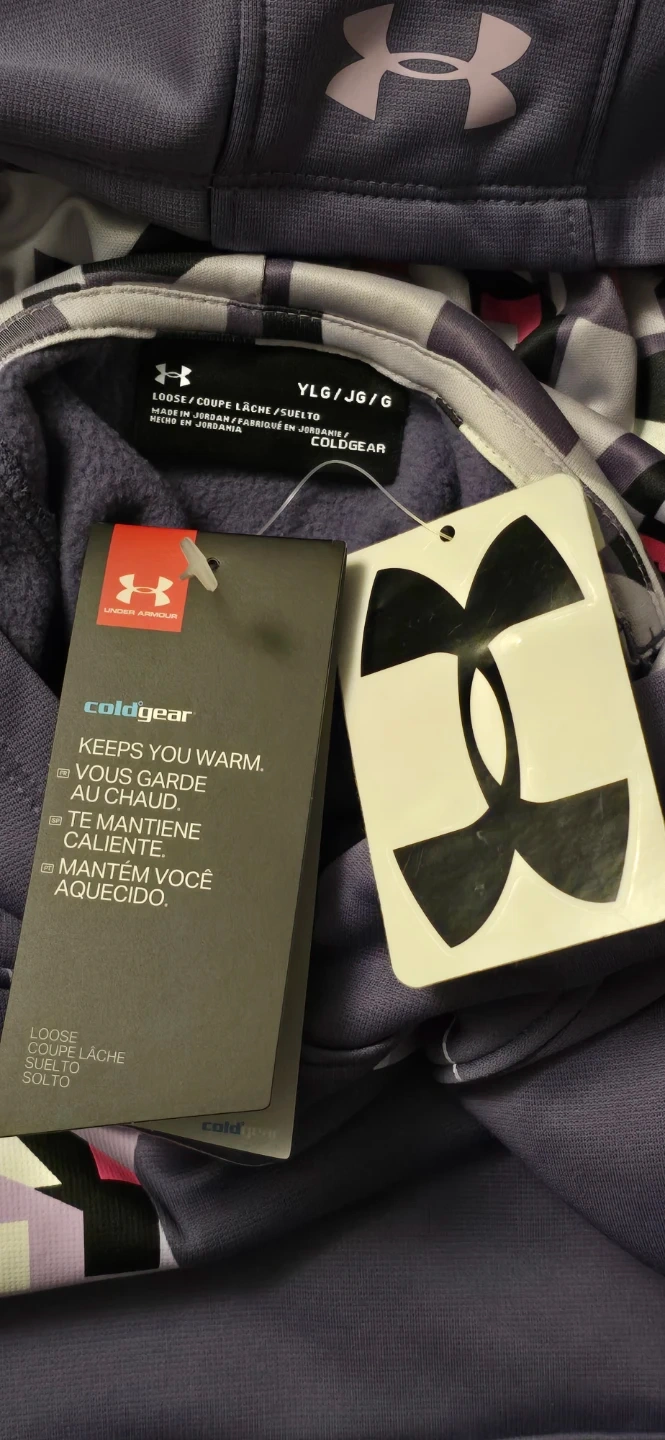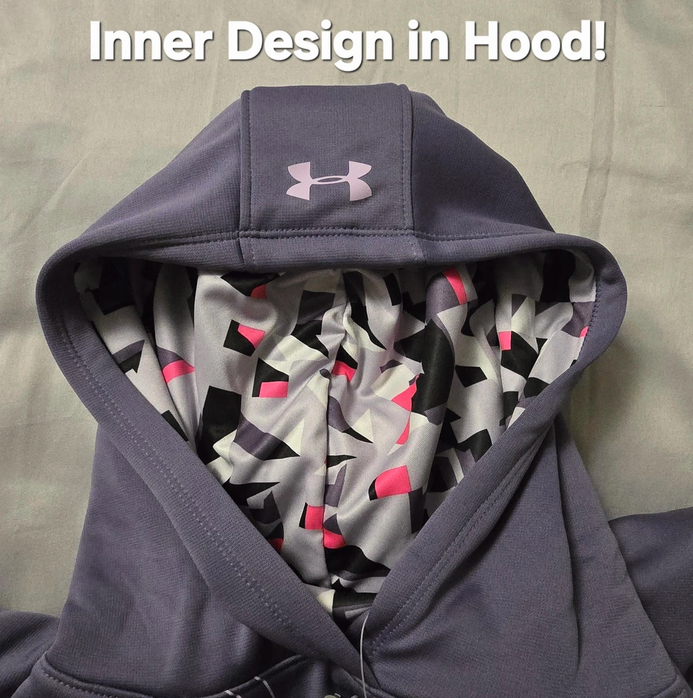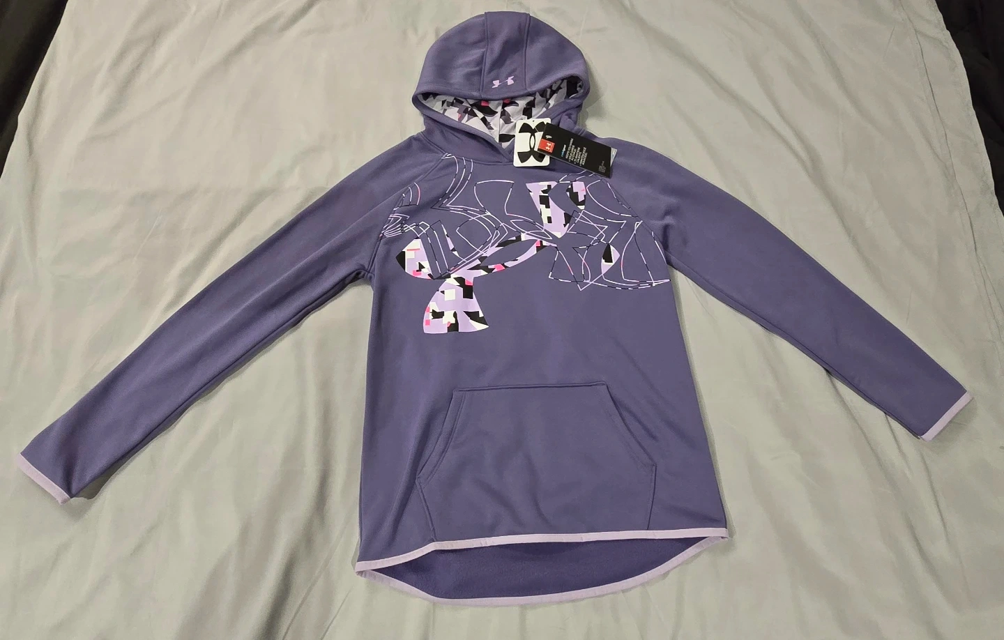 Brand new with tags, Girl's Purple Under Armour hoodie with Coolgear technology! It's a lovely shade of purple with a cool design on the front and a fun pattern inside the hood. Perfect for staying cozy!