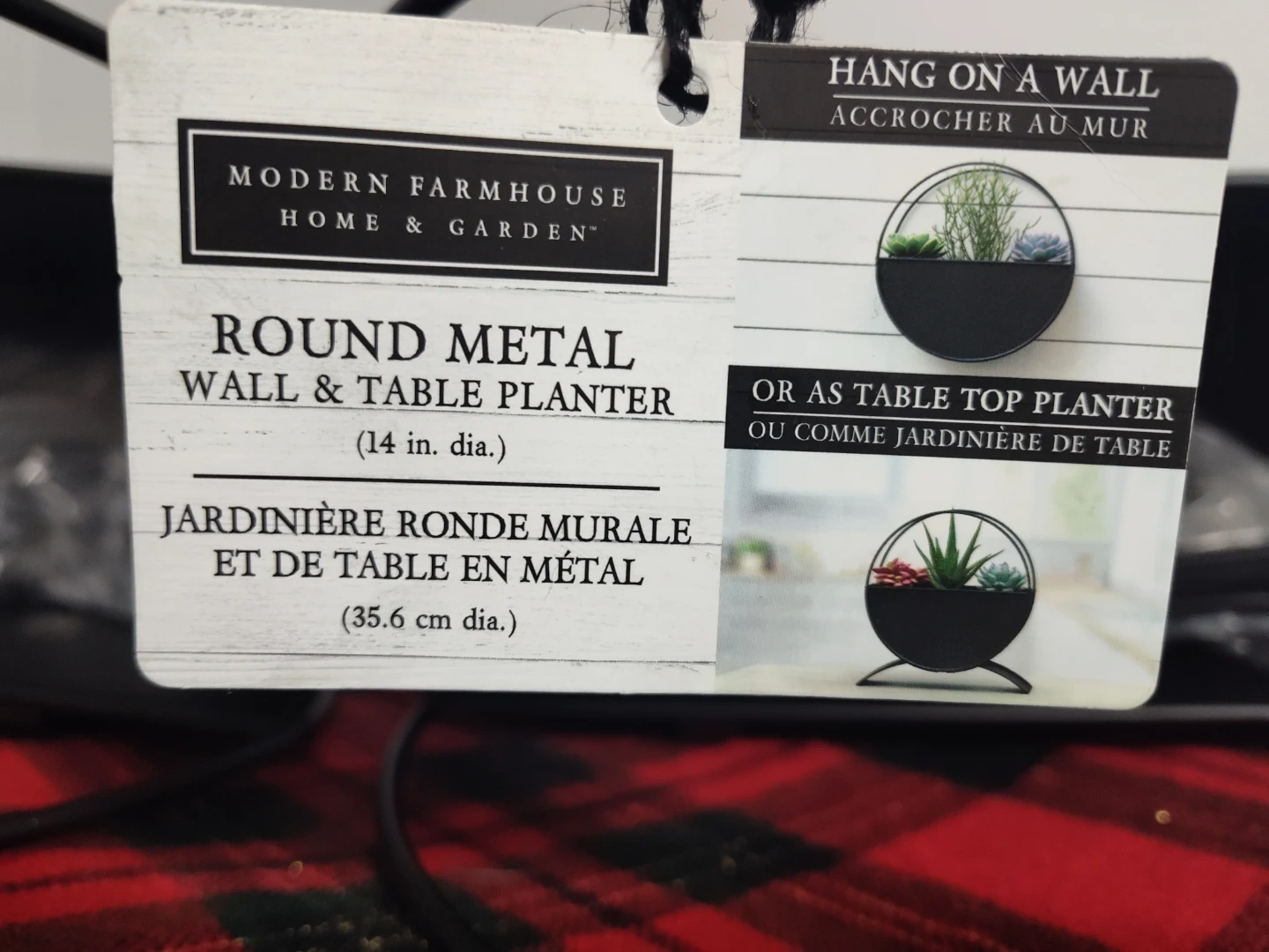 Selling a brand new Modern Farmhouse Round Metal Wall & Table Planter! It's 14 inches in diameter (35.6 cm). You can hang it on a wall or use it as a table top planter.