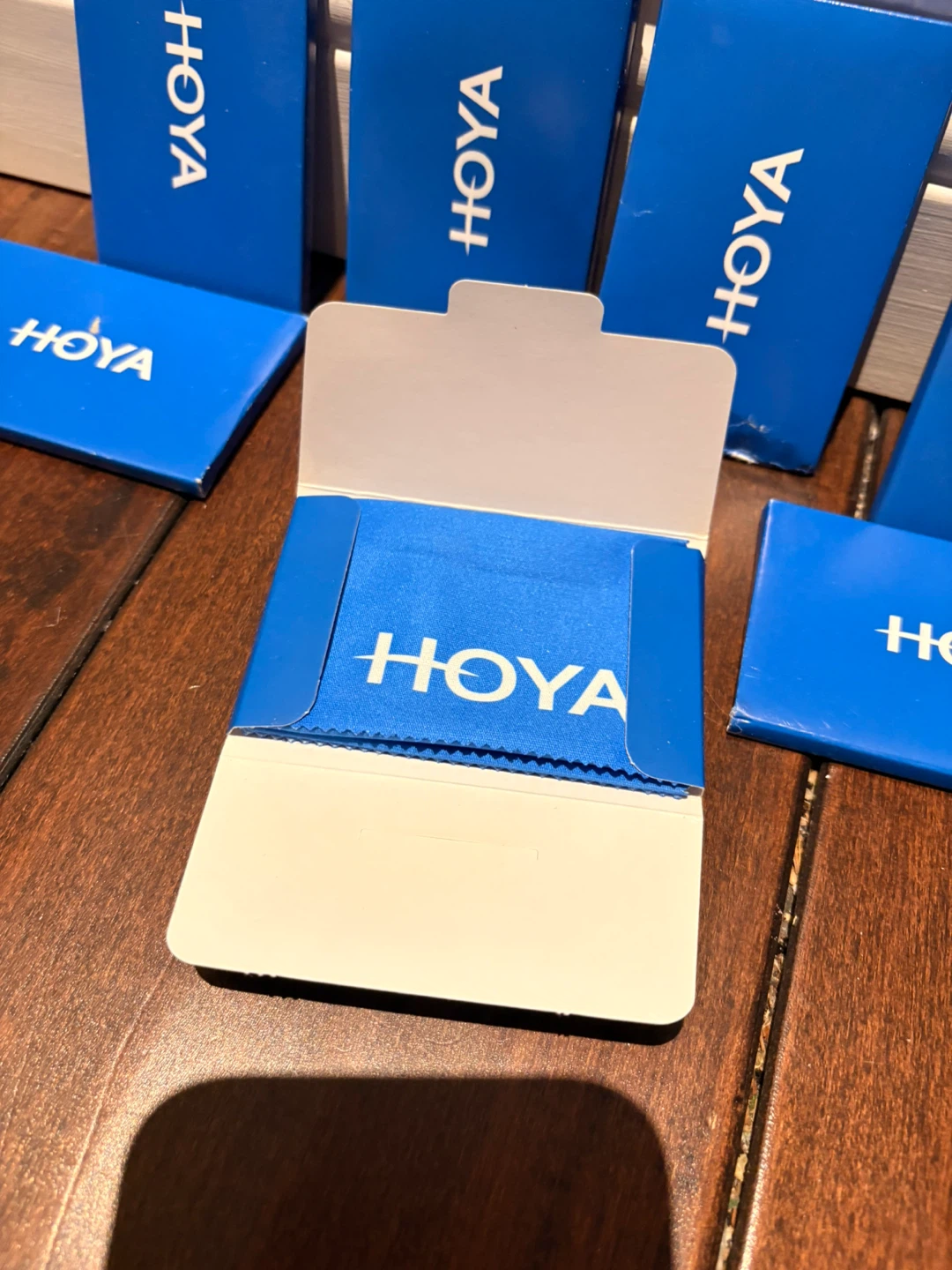 I have some new HOYA microfiber cloths for sale! These cloths are designed with ultrafine micro-fiber technology, making them safe for all types of lenses, including plastic, glass, and AR coated lenses. They're great for removing dirt and oily smudges. You can reuse them by machine or hand washing!