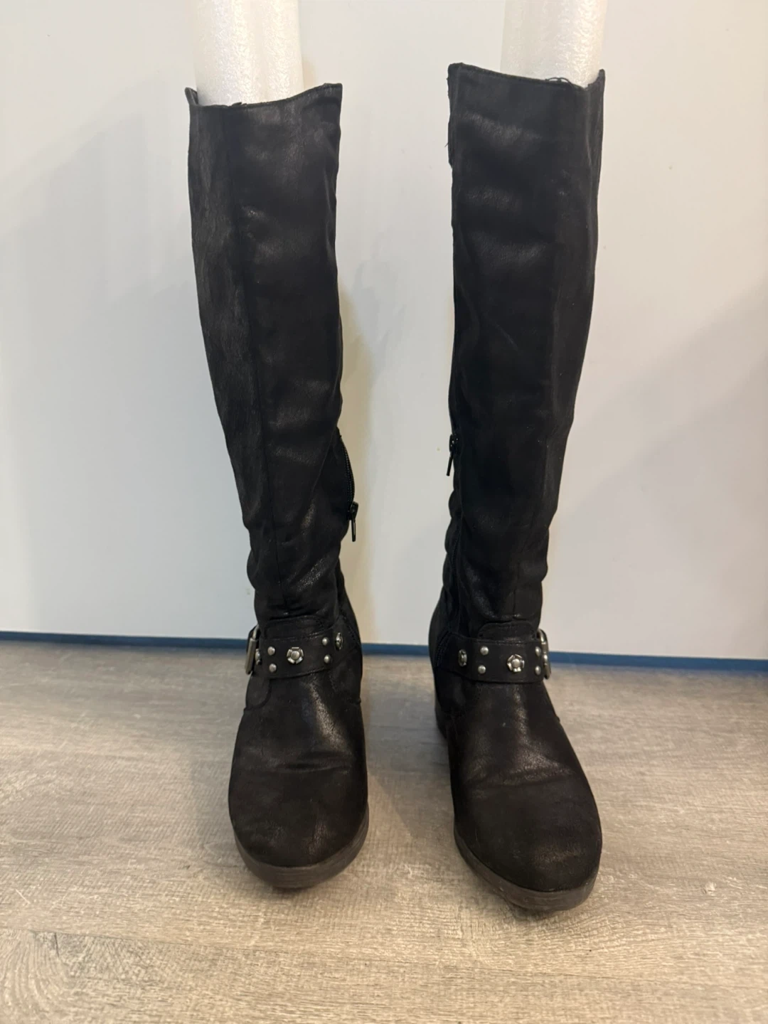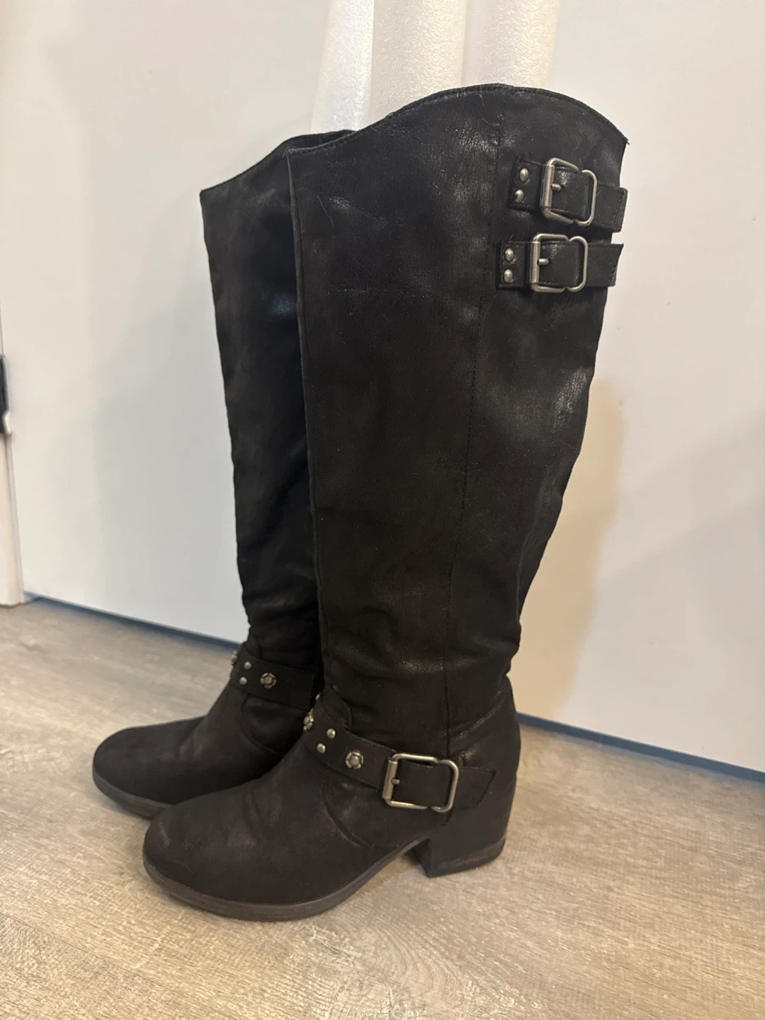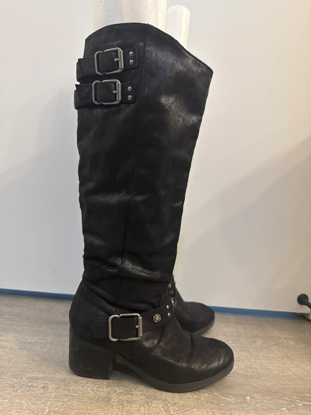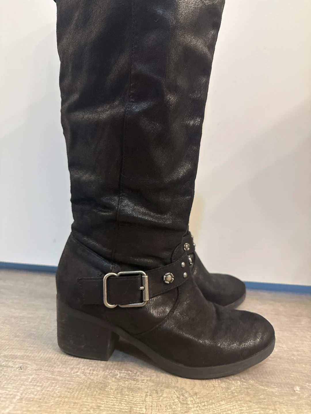 These black leather boots feature a stylish buckle detail. They are perfect for adding a bit of edge to your outfit. The boots are in good condition and ready for a new owner!