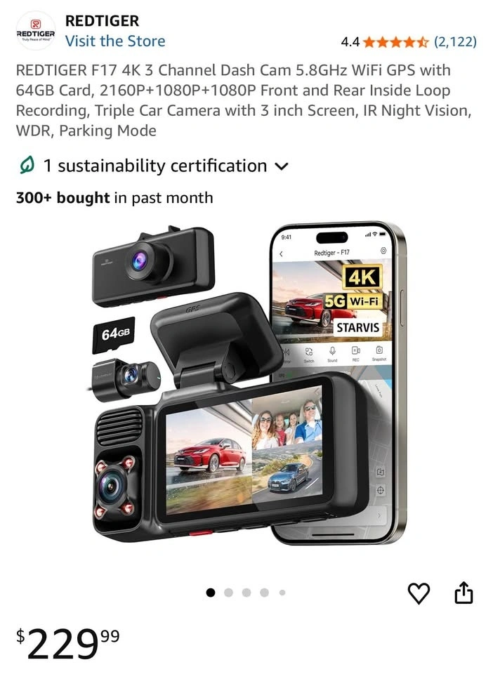 REDTIGER F17 premium 3-channel dash camera in excellent condition. Records front, rear, and inside cabin simultaneously — perfect for daily driving, Uber/Lyft, or family safety.