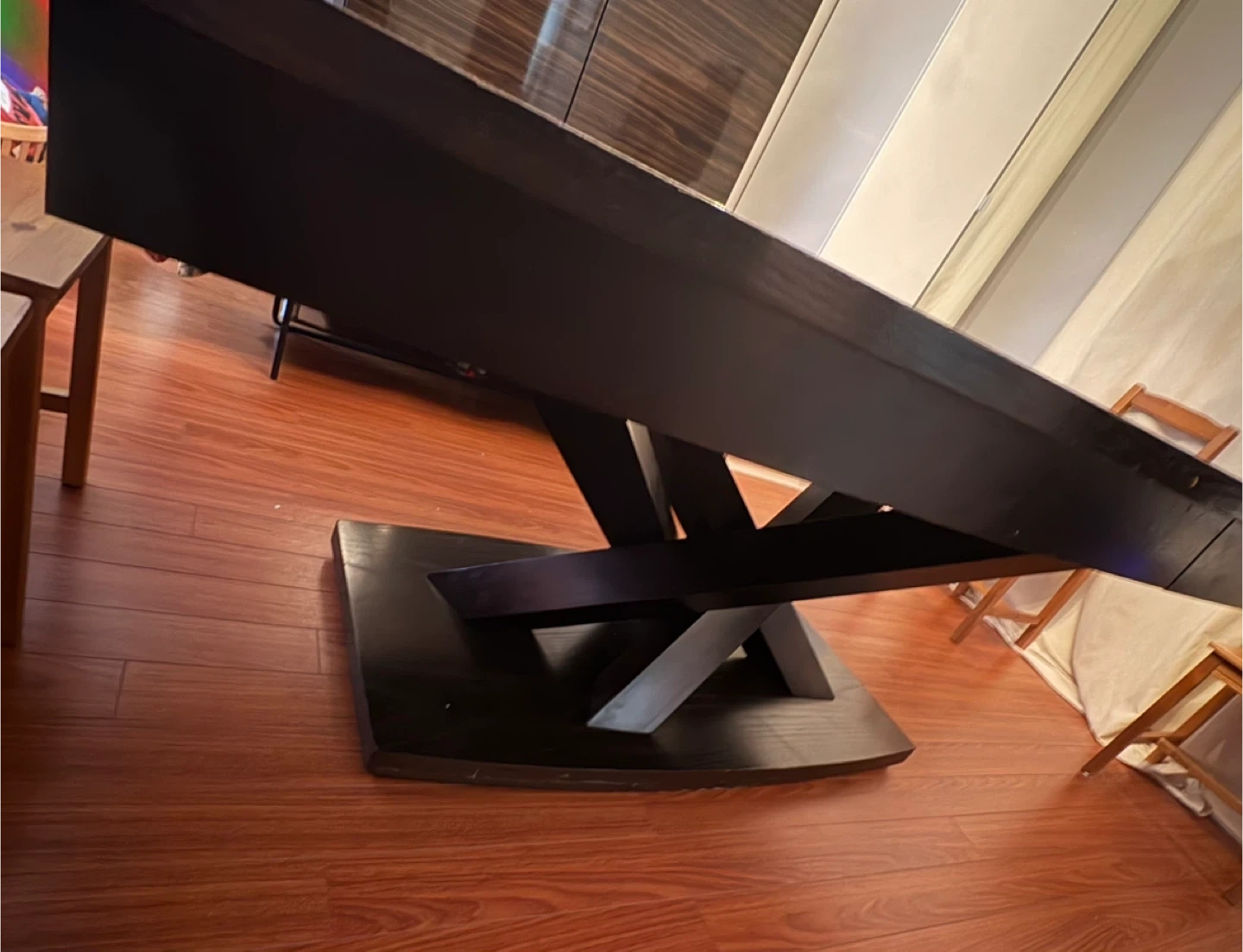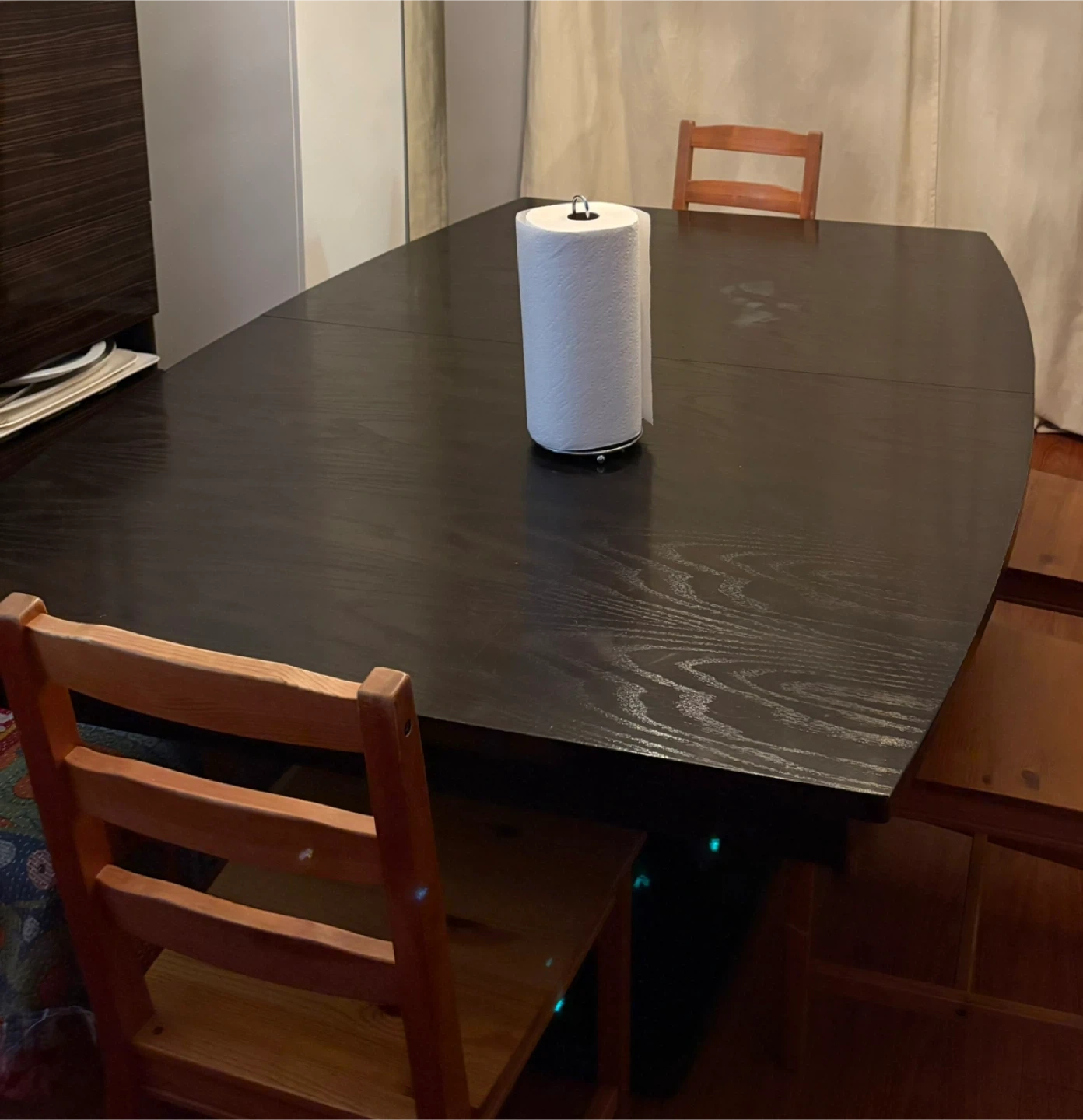 Selling a large dining table with a dark wood finish. It's in good condition and ready for a new home.
