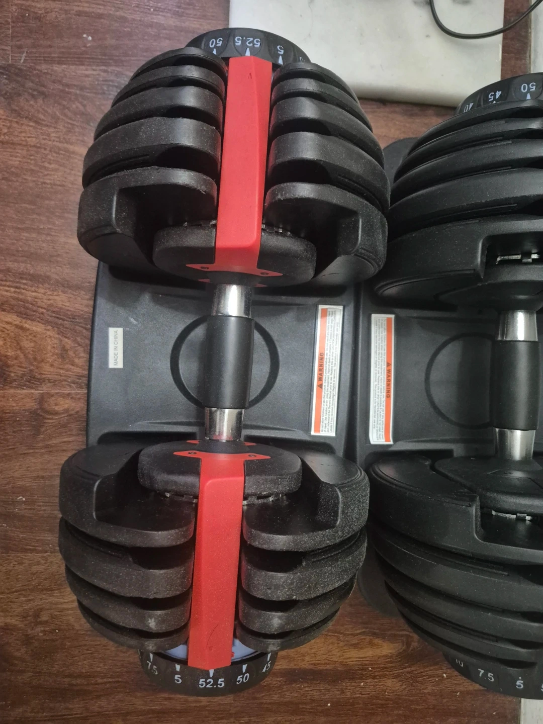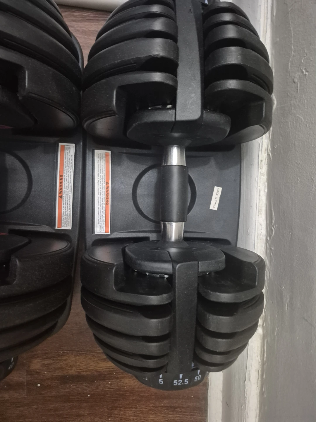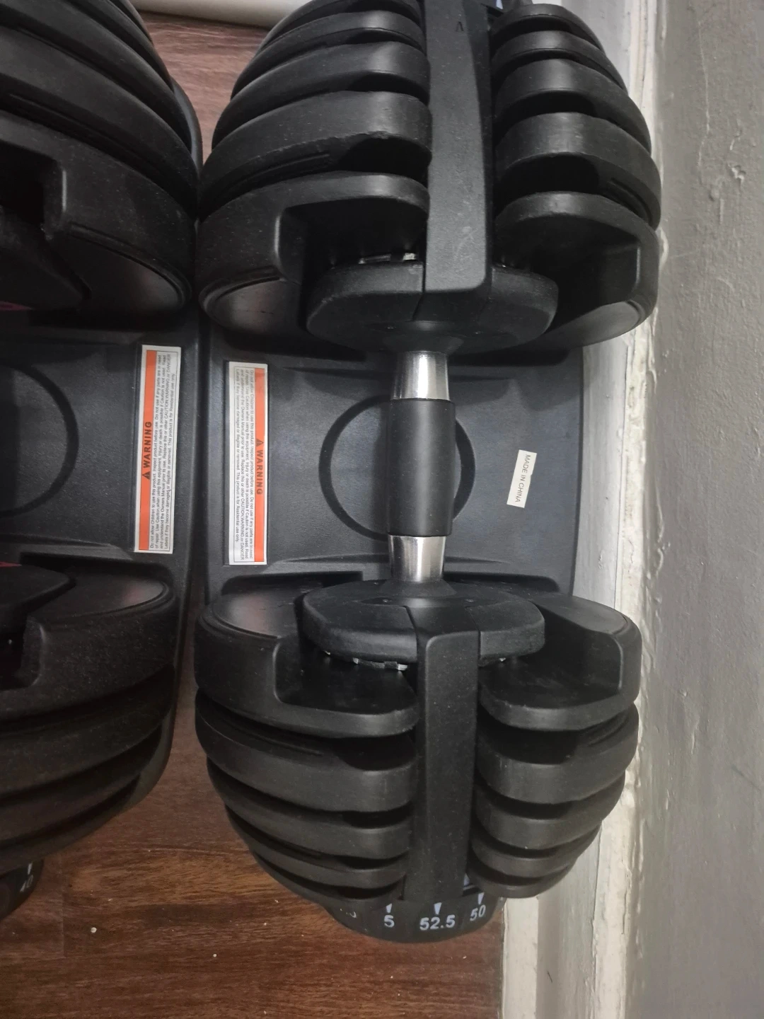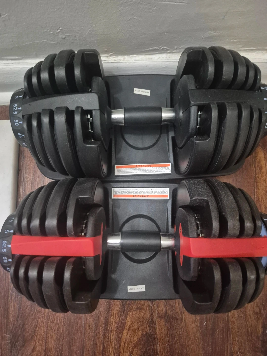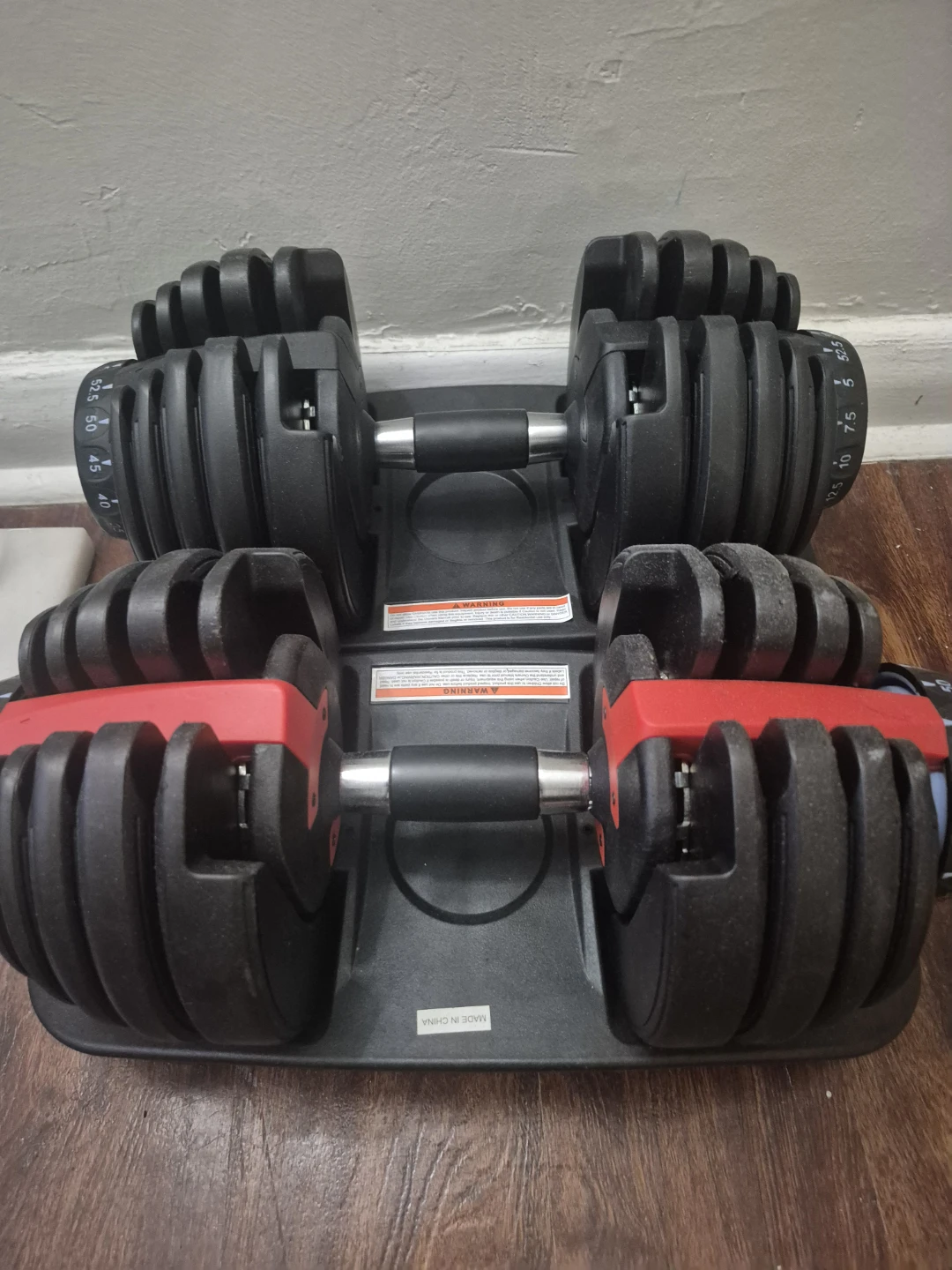 Selling a set of adjustable dumbbells. They appear to be in good condition and ready for your home gym! Perfect for a variety of exercises and fitness levels