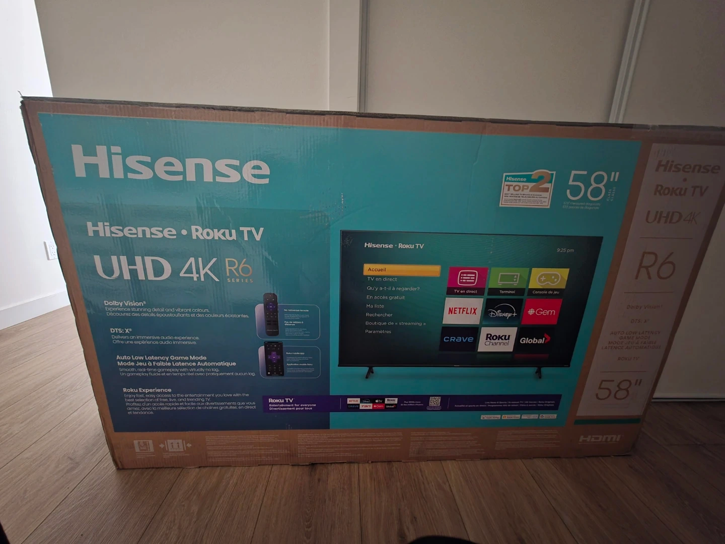 Selling a Hisense Roku TV, UHD 4K, 58 inch, R6 Series. It comes with Dolby Vision and DTS:X for an immersive audio-visual experience. Also features Auto Low Latency Game Mode for a smoother gaming experience. Sealed box. Unopened. Unused. Brand new.