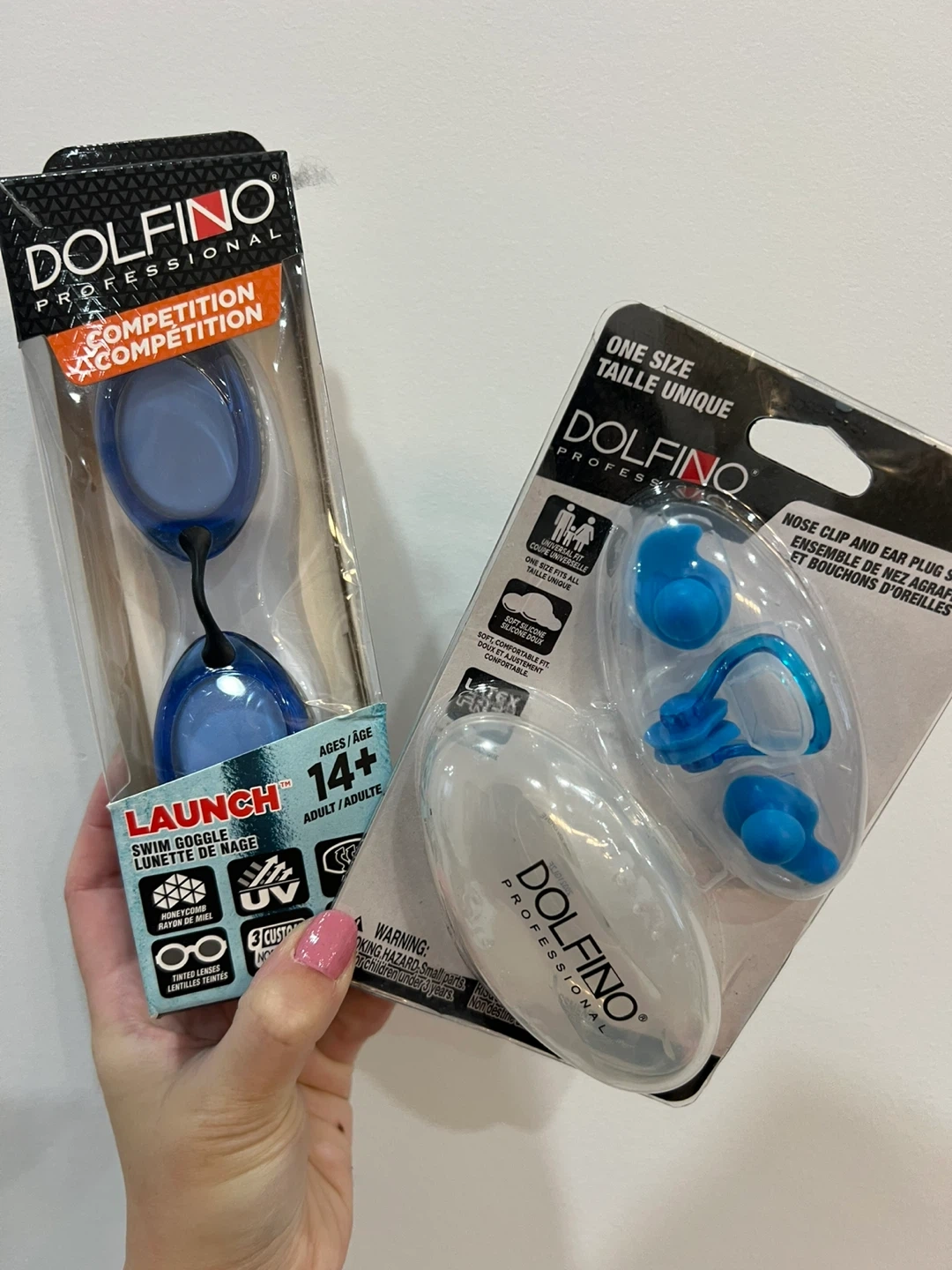 I'm selling a brand new Dolfino swim set! It includes swim goggles and a nose clip/ear plug set. The goggles are designed for ages 14+ and feature tinted lenses. The nose clip and ear plugs are one size fits all and made of soft silicone for a comfortable fit!