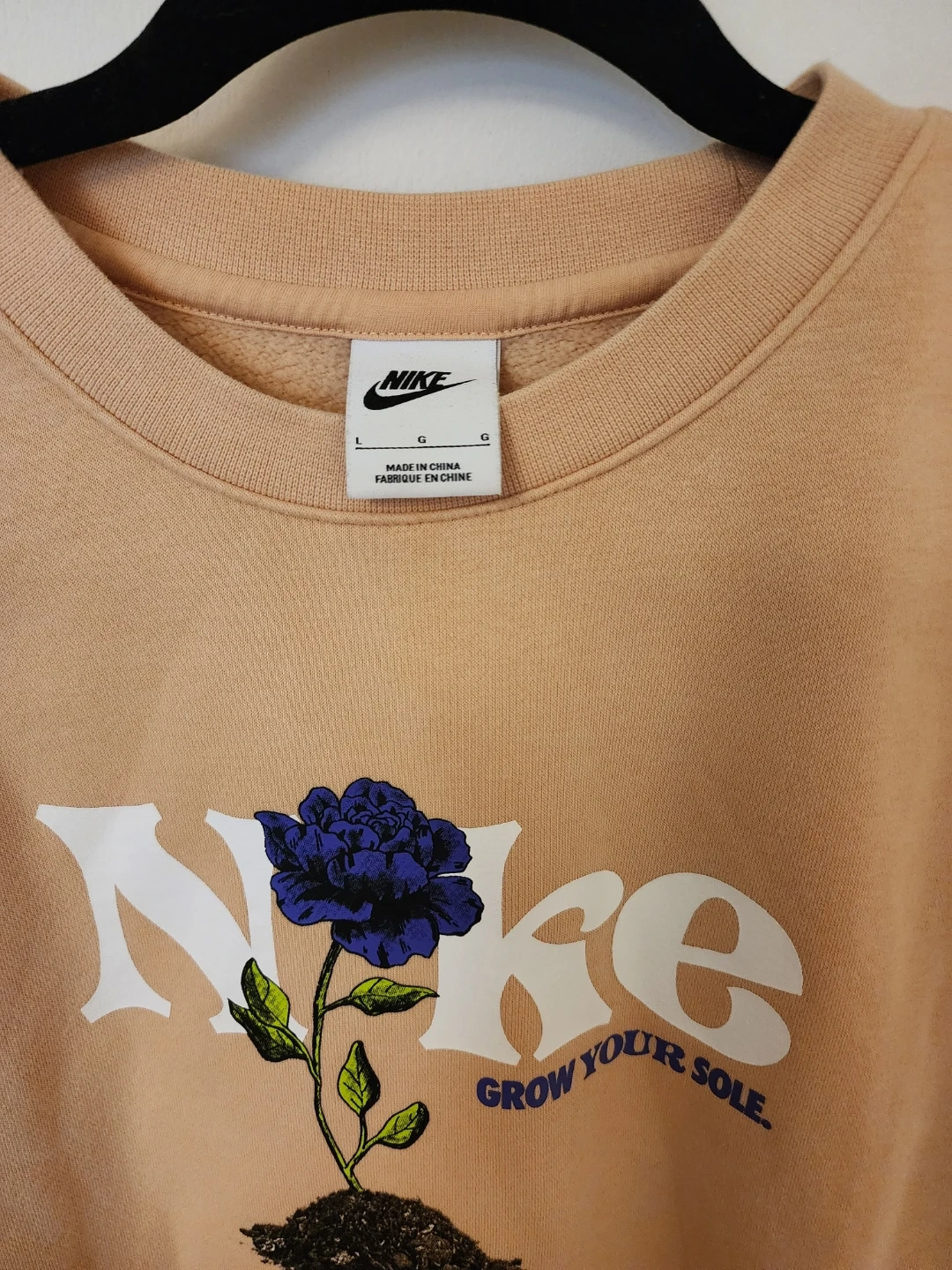 Selling a Nike crewneck sweatshirt in size L. It's a nice peach colour with a limited edition flower design. The material is soft and comfy, perfect for everyday wear. Please note, bought in Korea, size L may be more like a north American M.