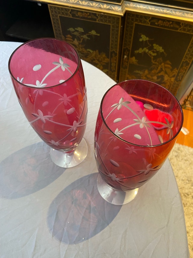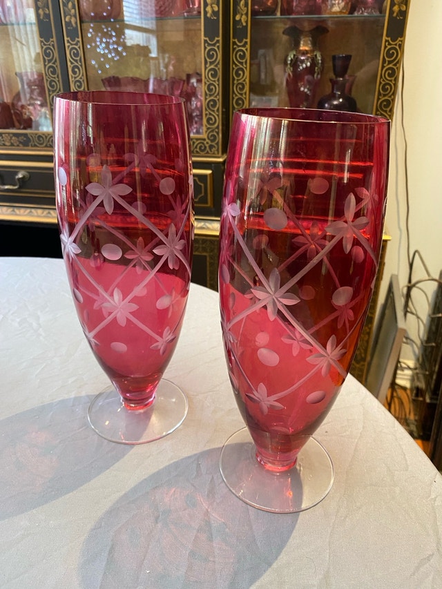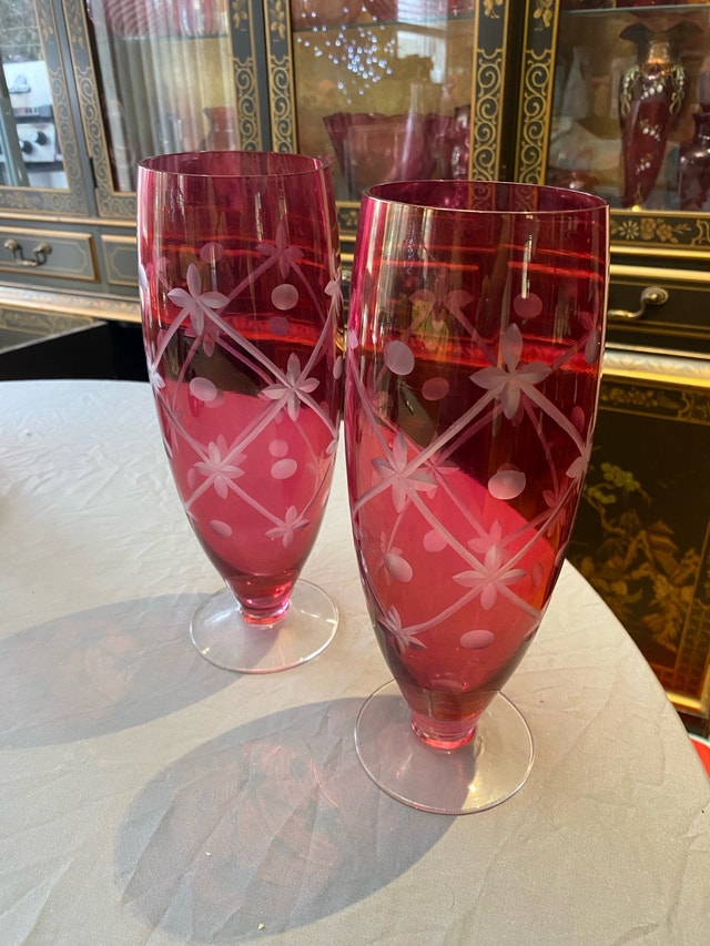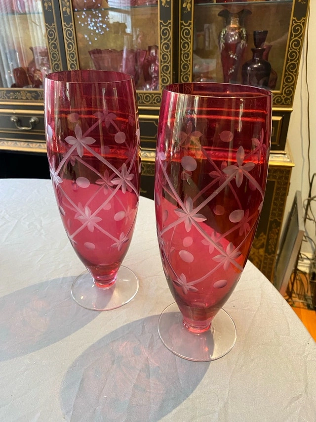 Elevate your home decor with this striking pair of vintage etched red glass vases, perfect for adding a touch of elegance and colour to any room; these are used. Each vase features a delicate floral pattern etched into the vibrant red glass, creating a stunning visual effect. H: 10.5” These vases would look stunning filled with fresh flowers or standing alone as decorative pieces. Although they are used, they are in very good condition.