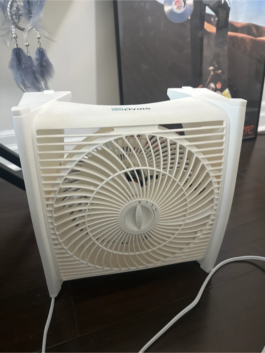 Selling a Living Essentials box fan in white. It's in good condition and ready to keep you cool!