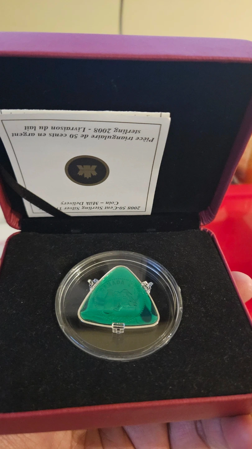 Selling a 2008 50-cent sterling silver triangular coin commemorating milk delivery. It comes in its original box