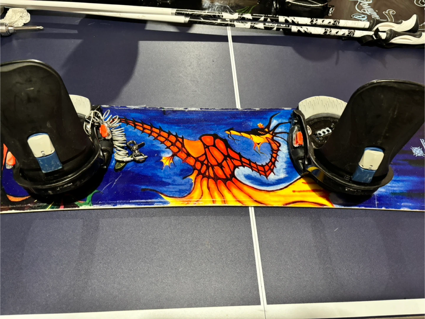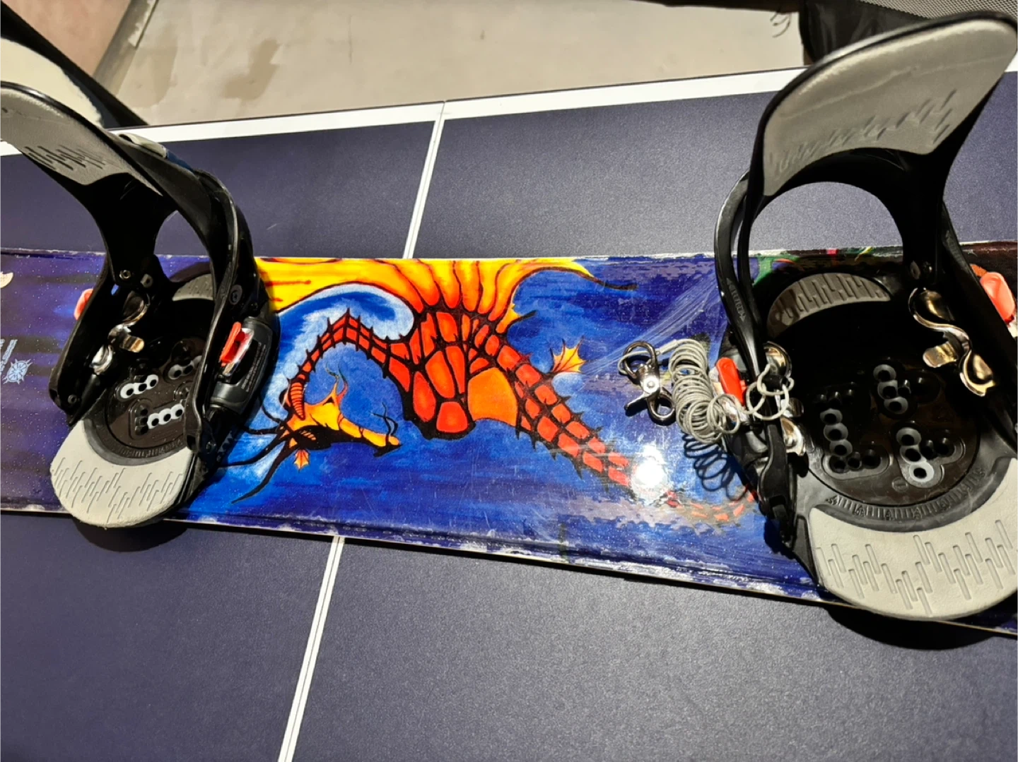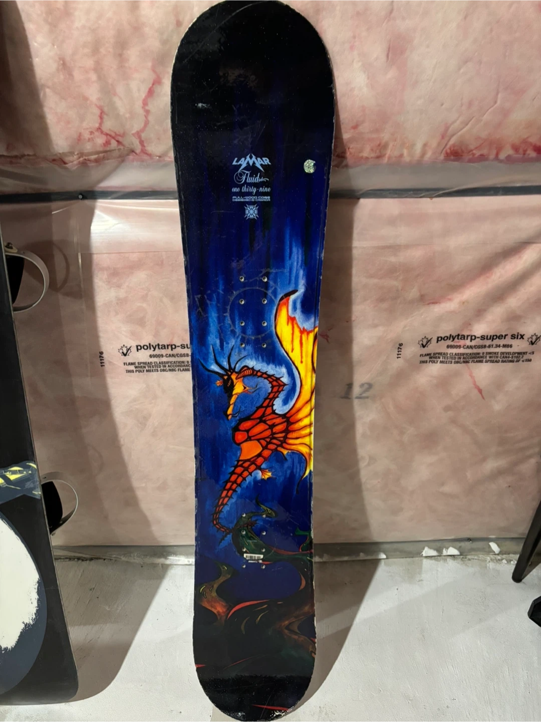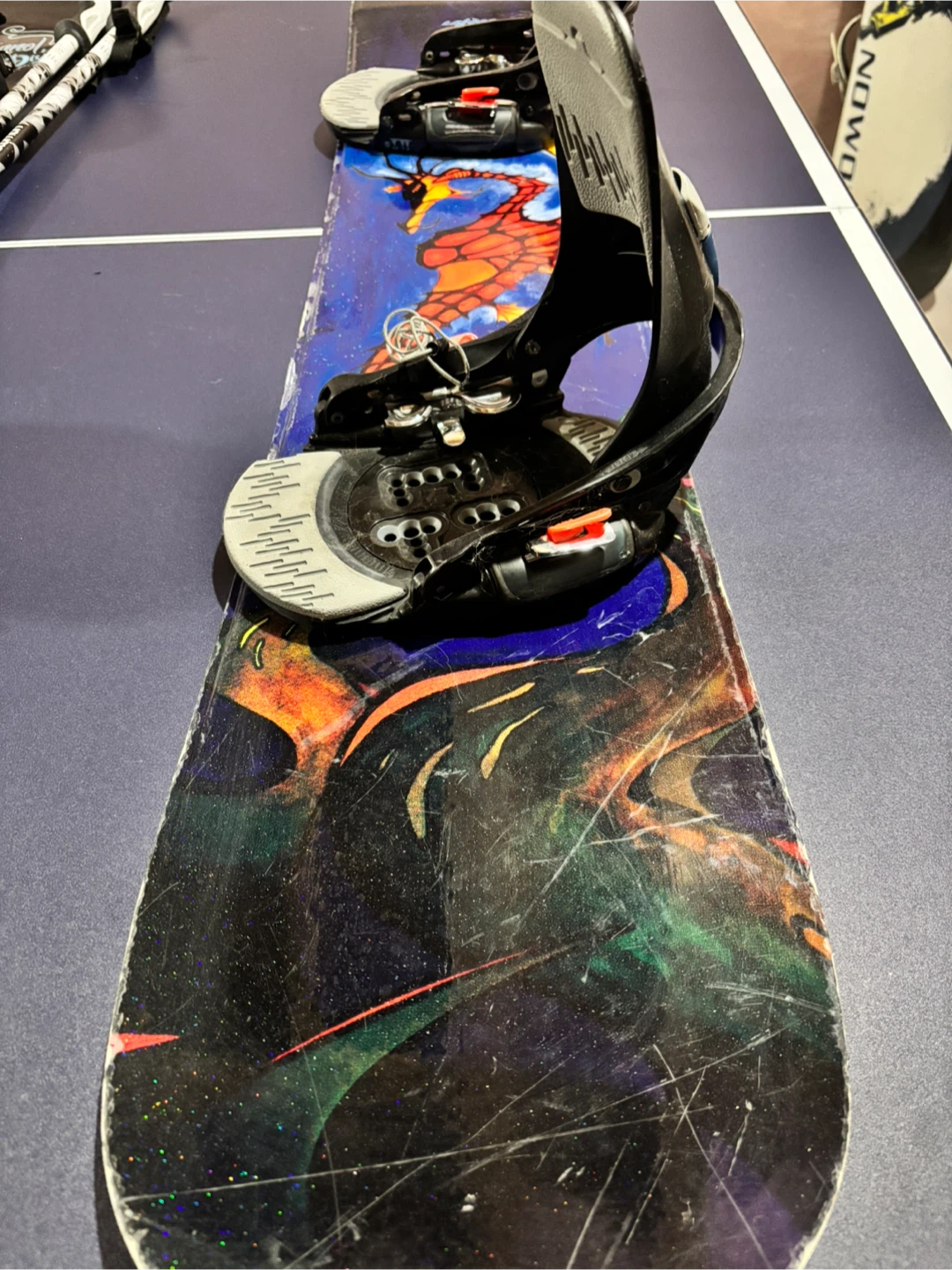 Selling a Lamar Fluid one thirty nine snowboard. It has a cool dragon design on it! There are some signs of wear, but it's still in good condition for hitting the slopes and comes with step on bindings.