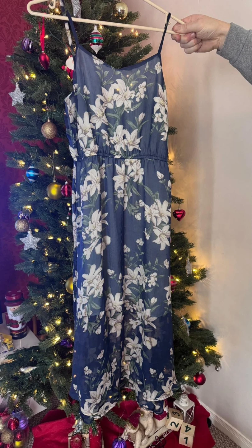 Here's a lovely floral print dress! It features a navy blue base with a white floral pattern. Perfect for a sunny day out or a casual evening event.