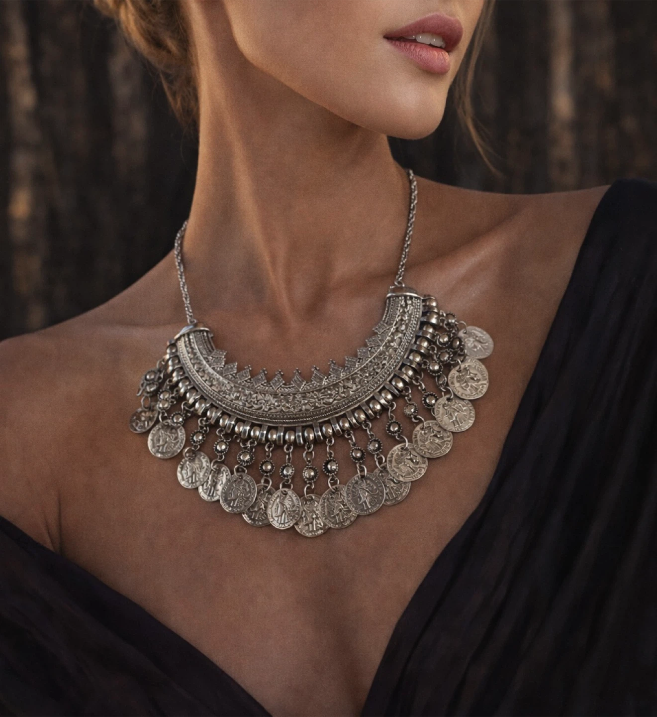 Striking silver-tone statement necklace featuring intricate metalwork and cascading coin fringe details. A bold, bohemian piece with global appeal—perfect for elevating simple outfits or styling for festivals, vacations, or evening looks.