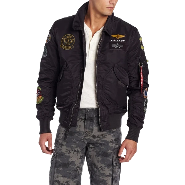 Selling an Alpha Industries bomber jacket in size medium. It's black with various patches on the front. A stylish and unique piece!