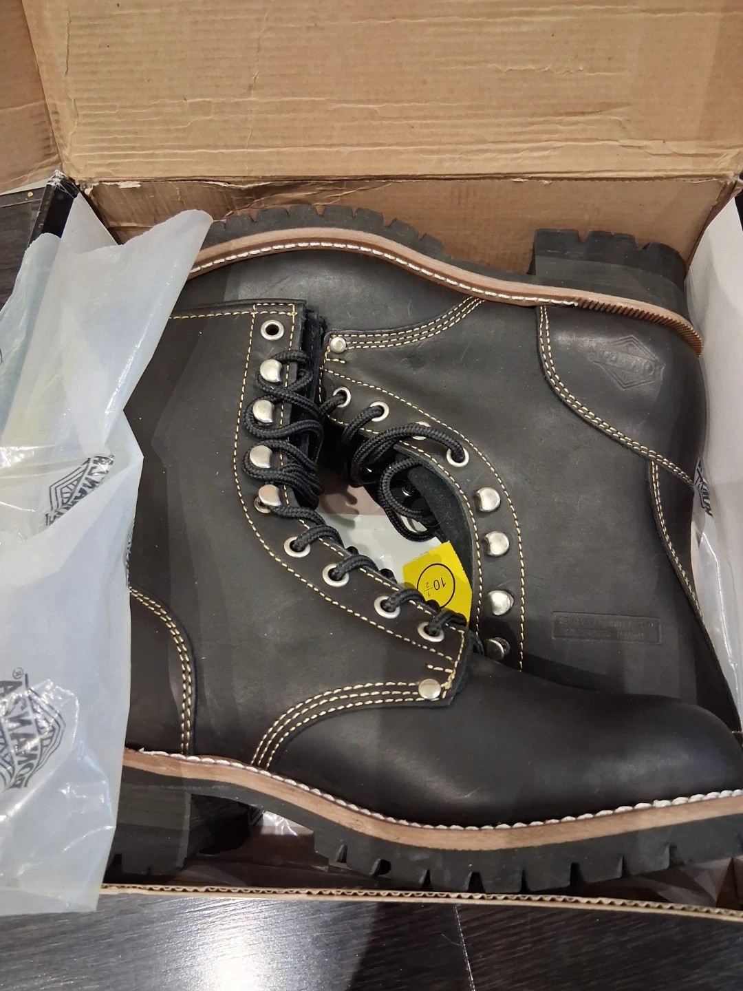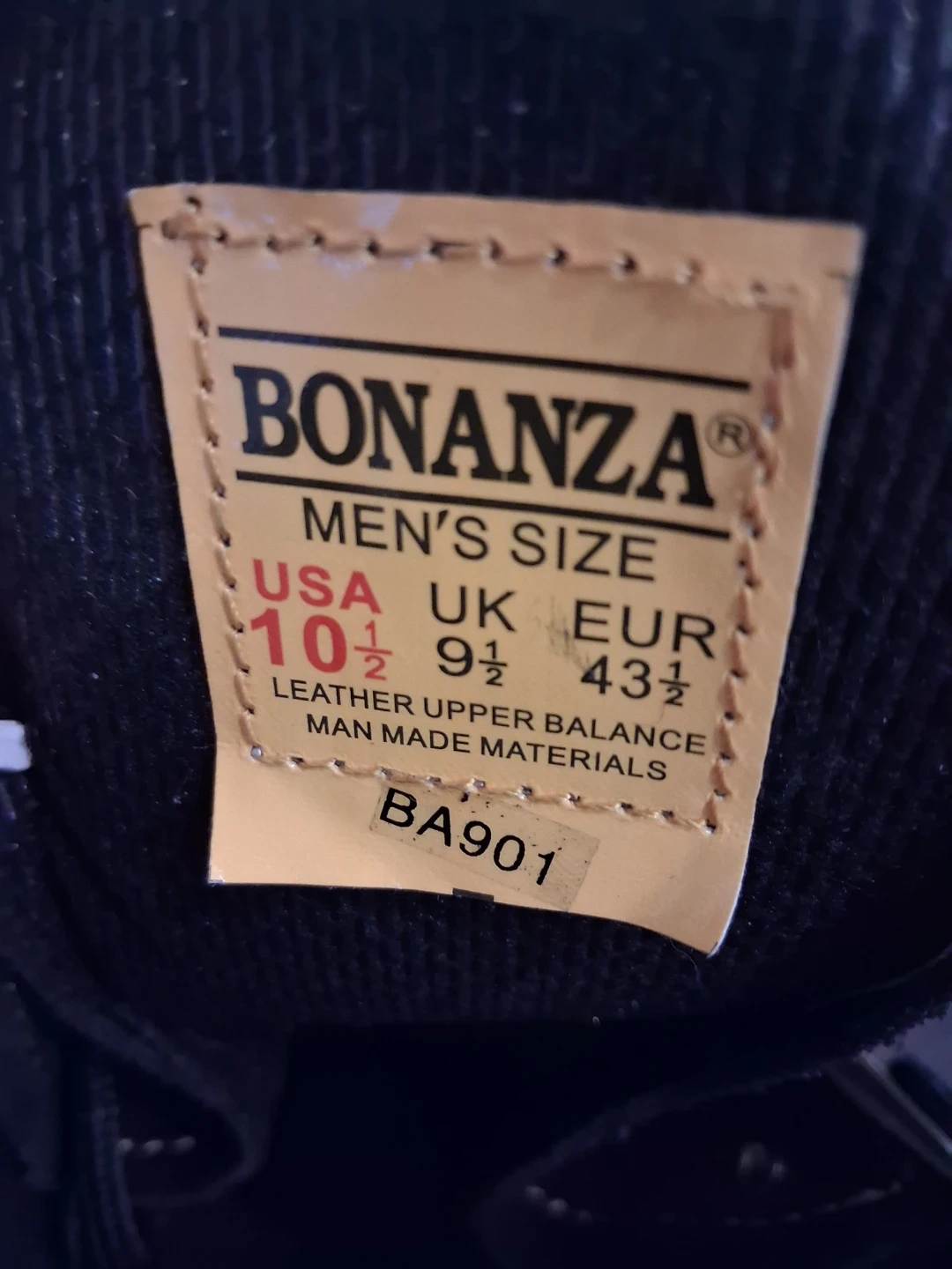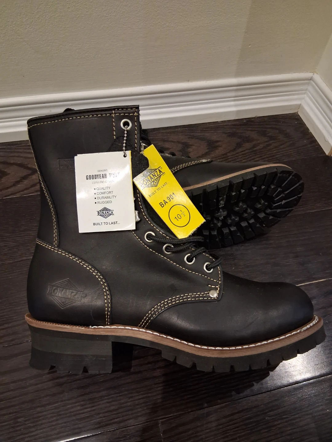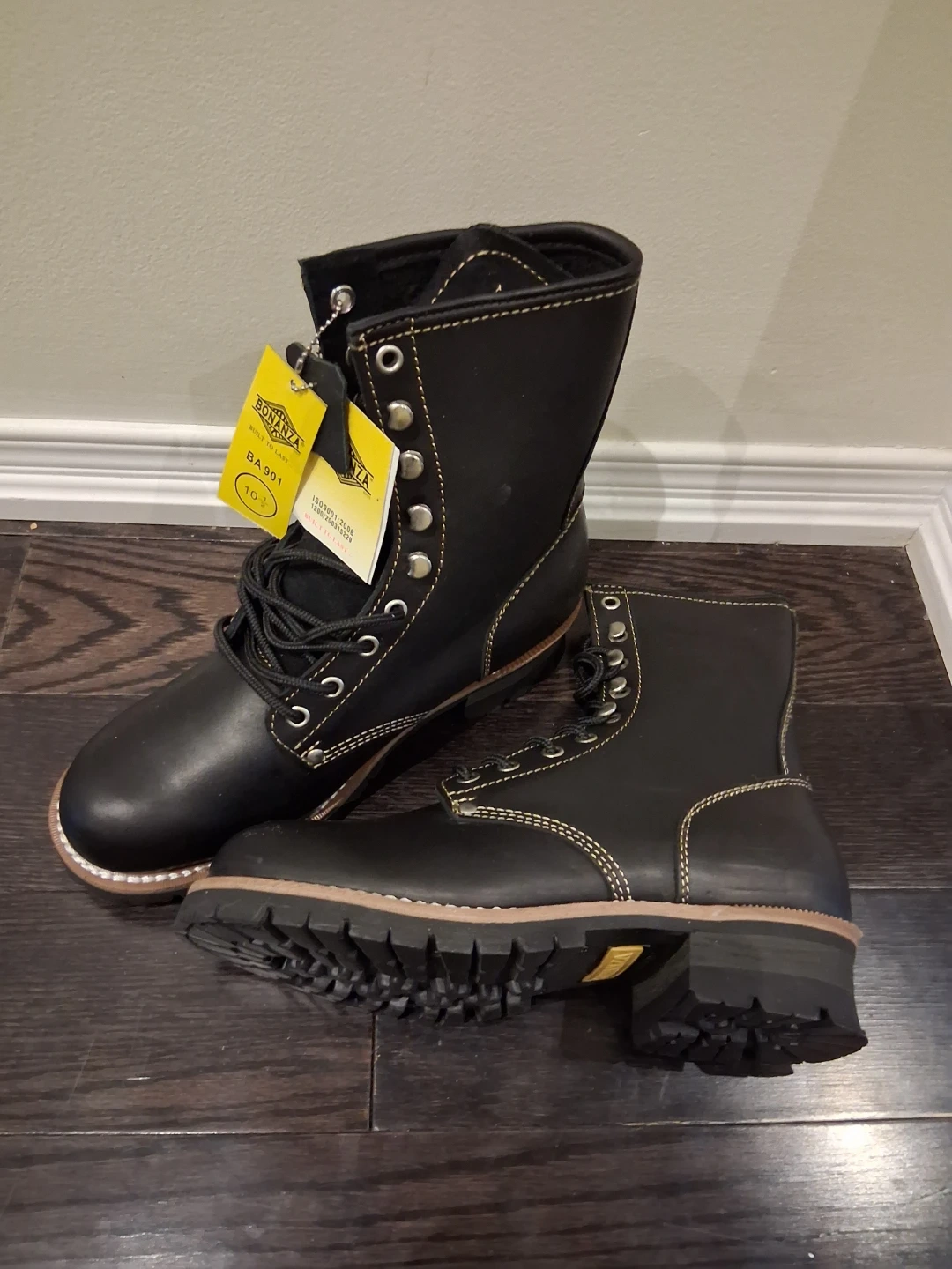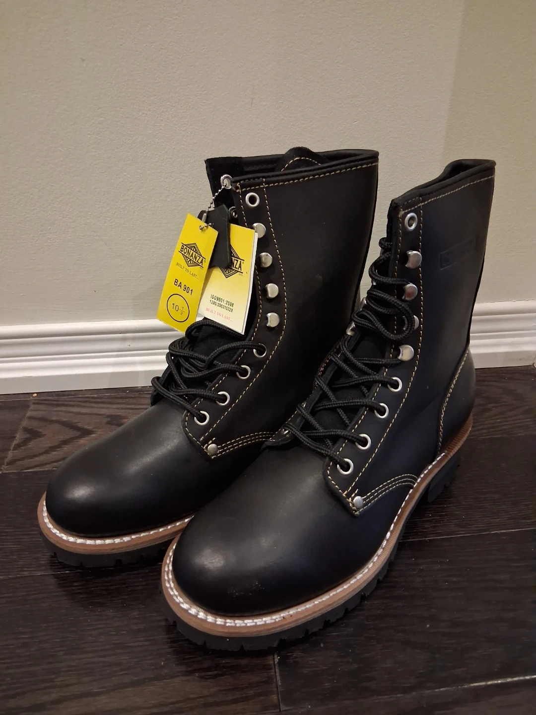 Selling a pair of Bonanza work boots in men's size 10.5. They're black leather with a man-made balance. The model number is BA901. These boots are built to last and ready for any tough job! They are in great condition and include the original box