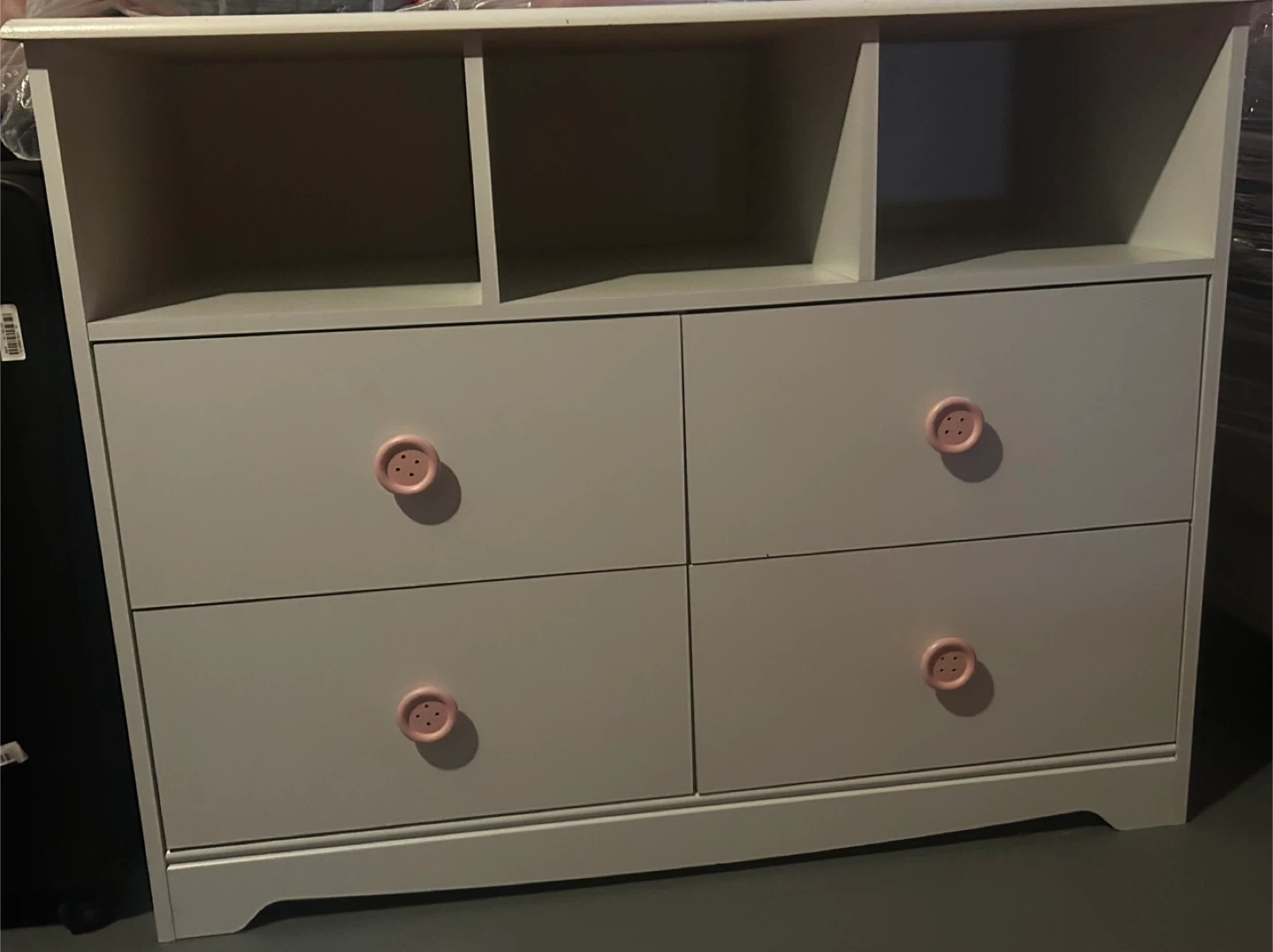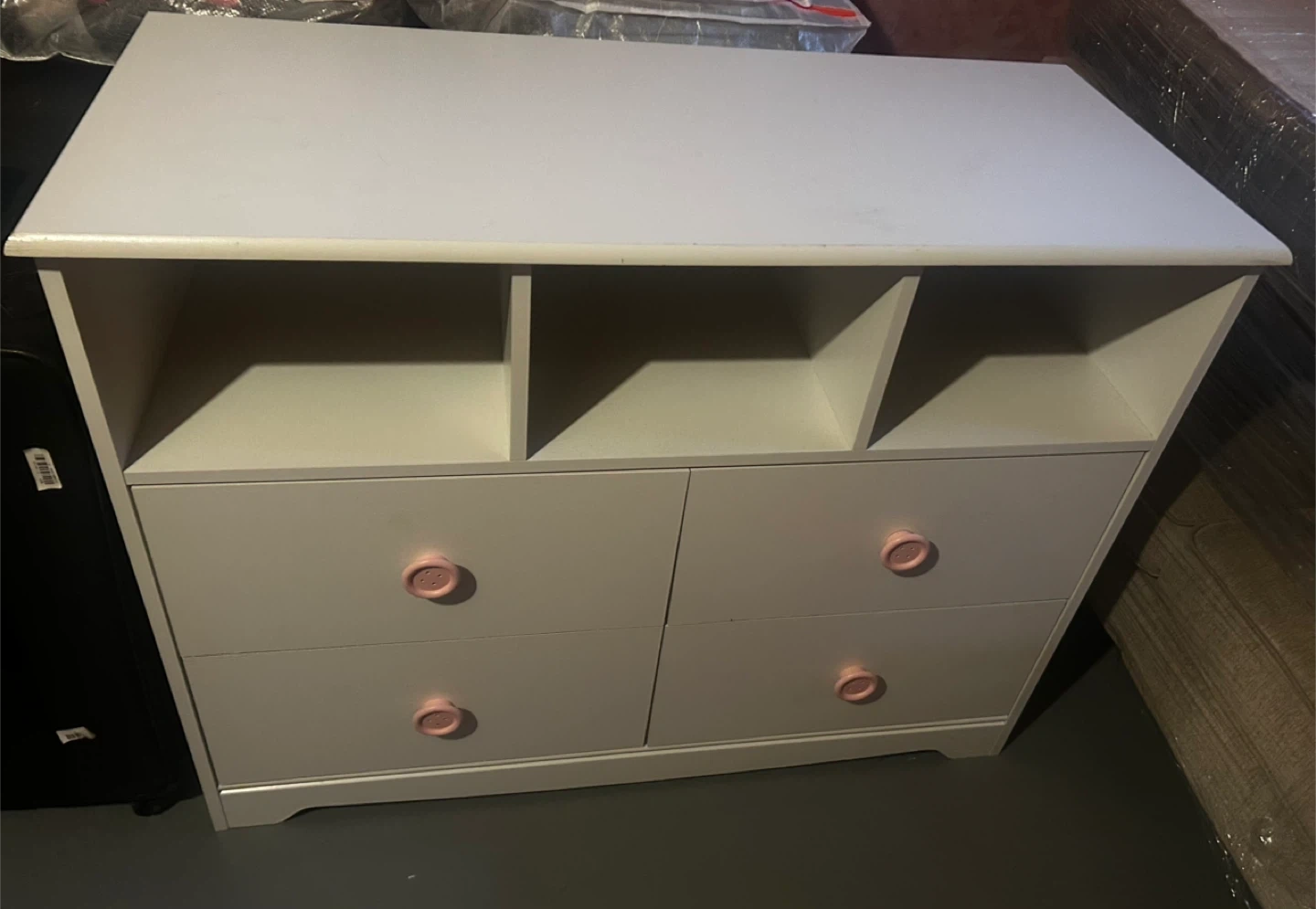 Here's a cute white dresser that would be perfect for a kids' room or nursery! It features four drawers with adorable pink knobs, plus open shelving on top for displaying books, toys, or other treasures. It's in great condition and ready for a new home!