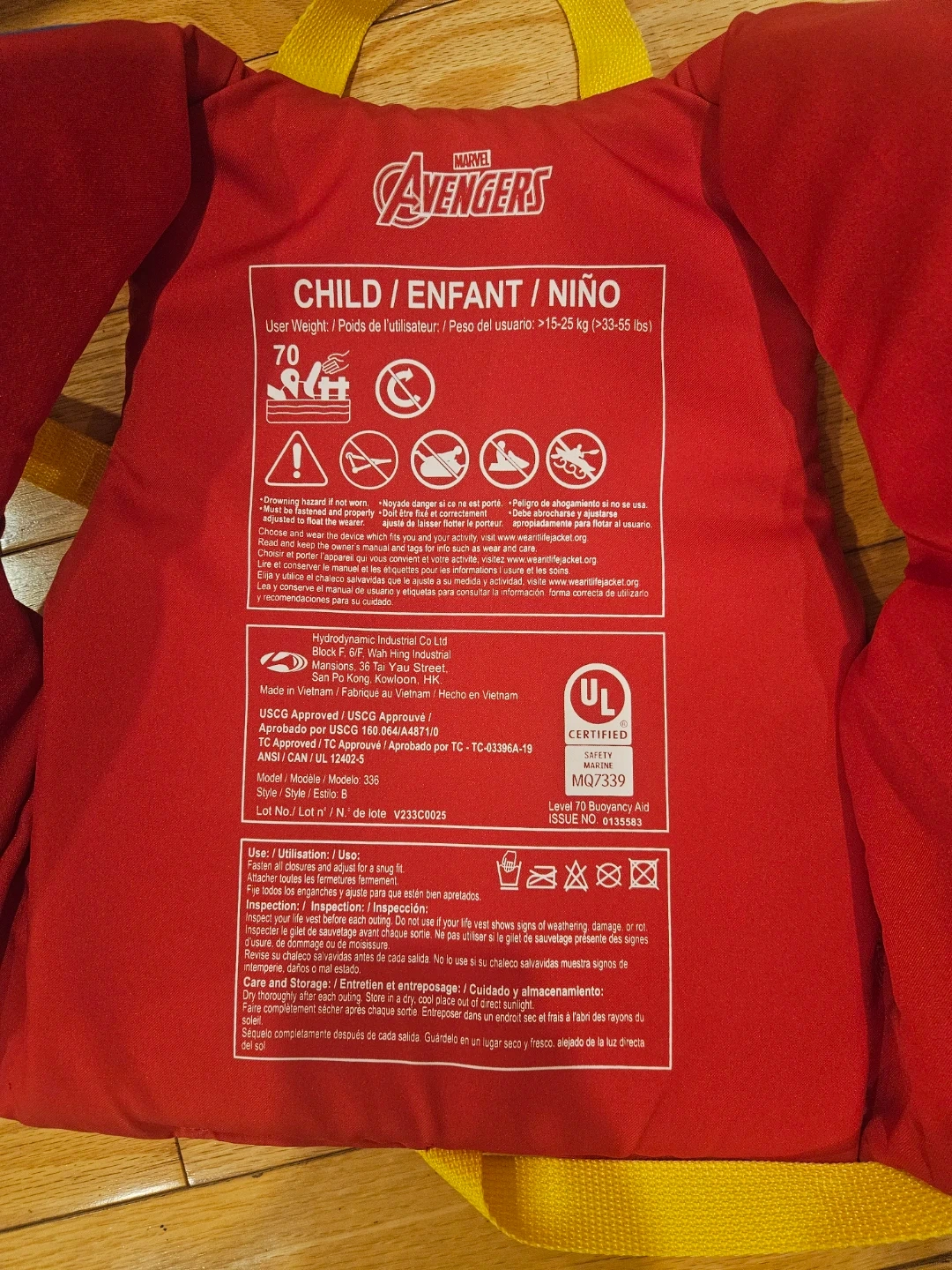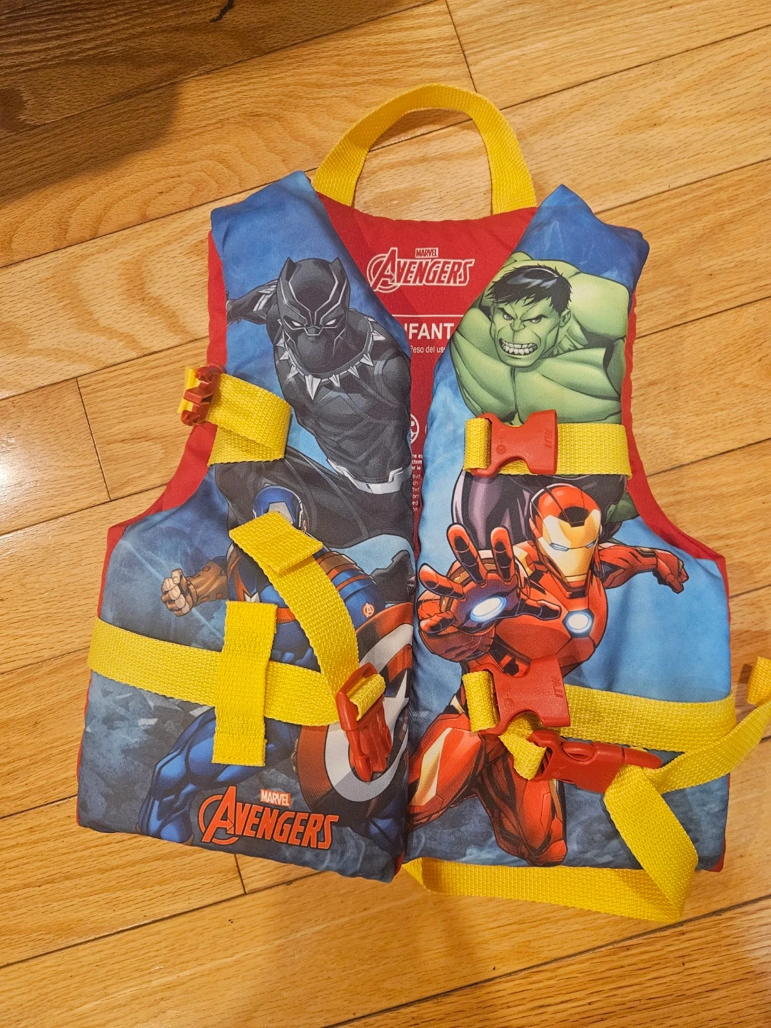 Here's a Marvel Avengers child-sized life vest! It's perfect for keeping your little one safe and stylish at the pool or lake. It fits children weighing 15-25 kg (33-55 lbs)
