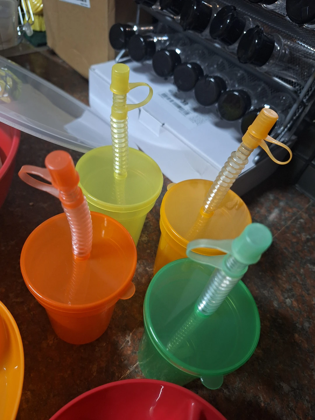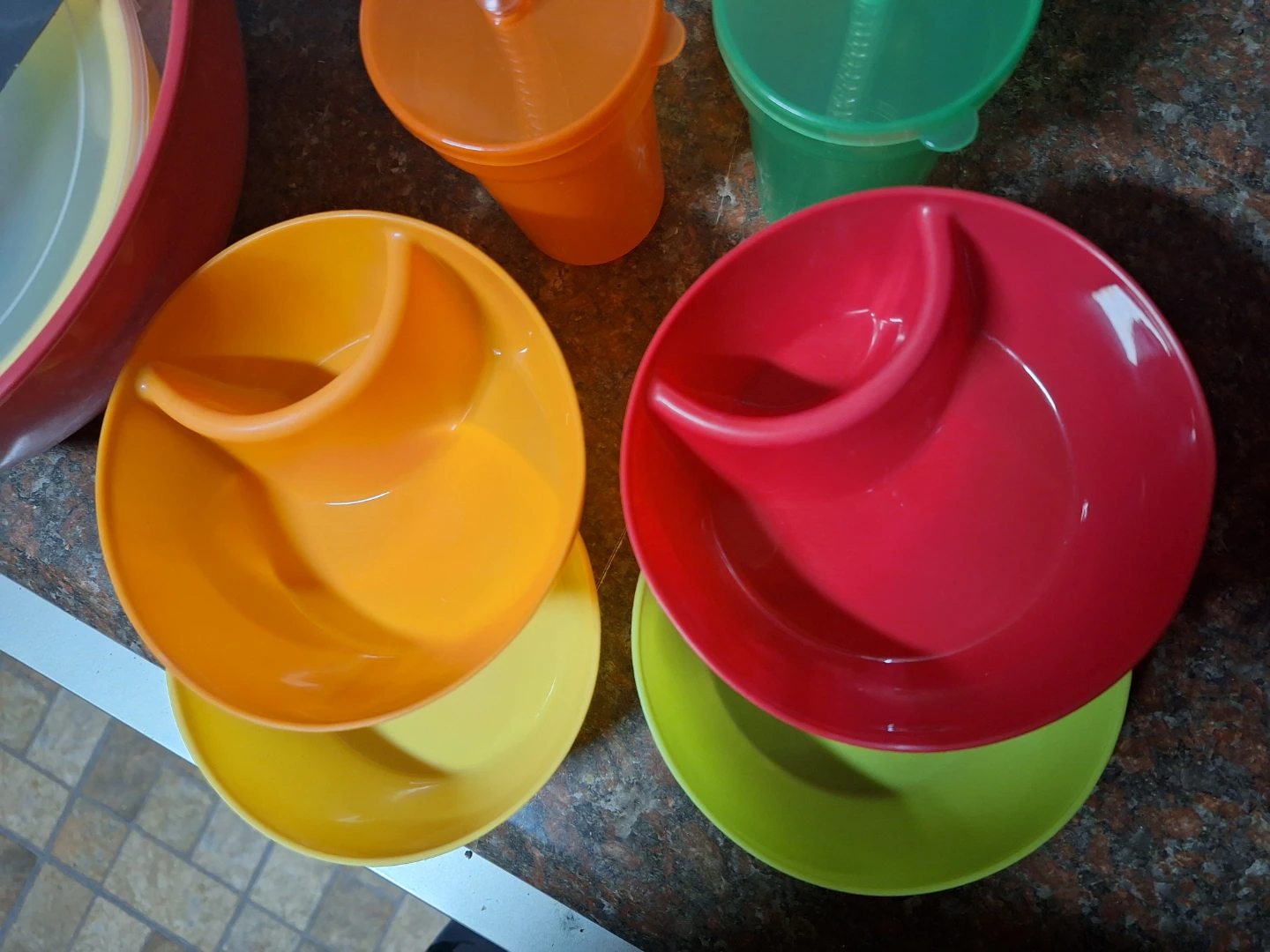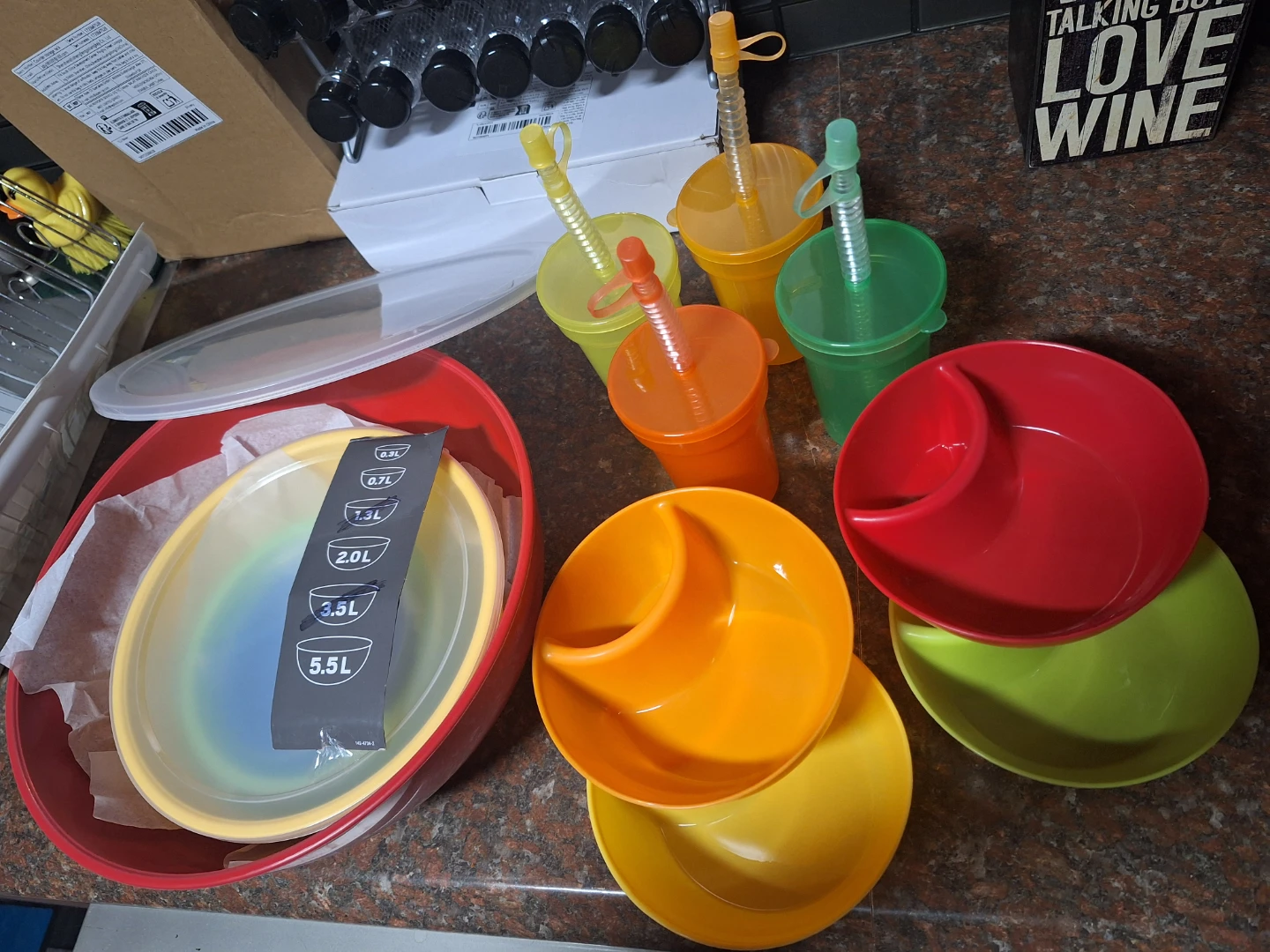 Selling a set of colourful plastic bowls and cups! Following is a list of everything included: - 4 divided snack bowls - 4 spill-proof cups with straws - 0.3L mixing bowl - 0.7L mixing bowl - 2L mixing bowl - Large 5.5L mixing bowl All brand new, never been used ✨️ Great for kids or to have in your kitchen! The cups are leakproof πŸ’§ = no spills! πŸ˜€ Get everything for only $17 Exclude the cups and get the rest for only $12