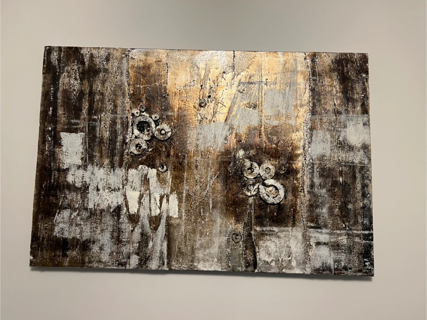 This is an abstract art piece with a unique design. It features a mix of brown, gold, and white colours with textured elements. It would be a great addition to any art collection or a statement piece for your home decor