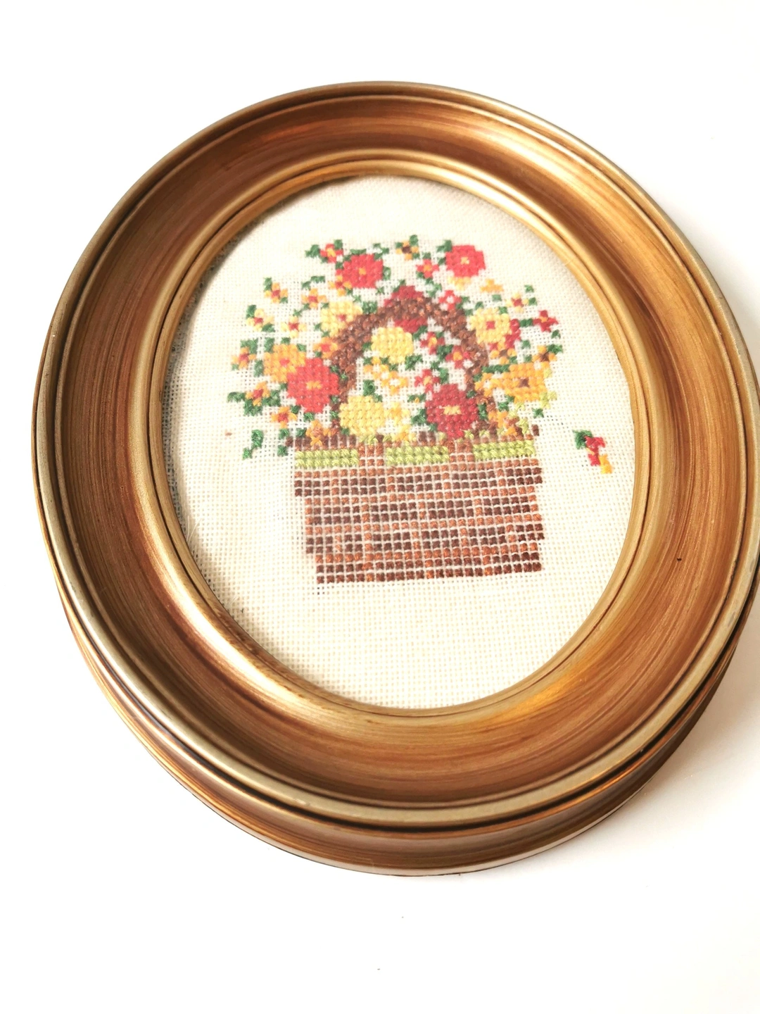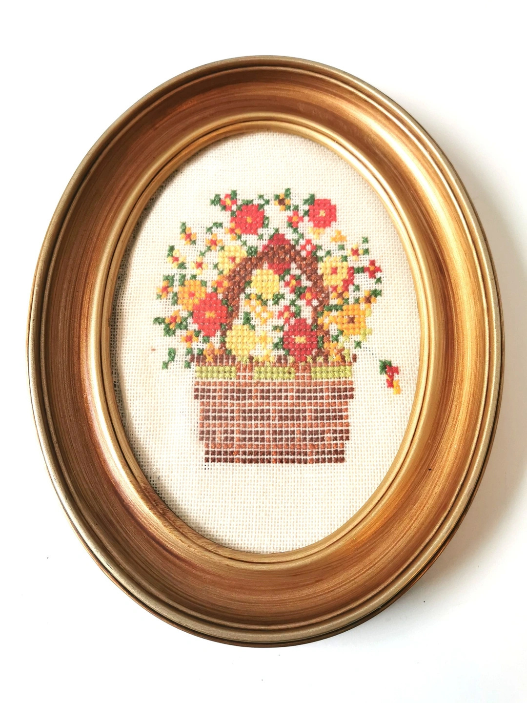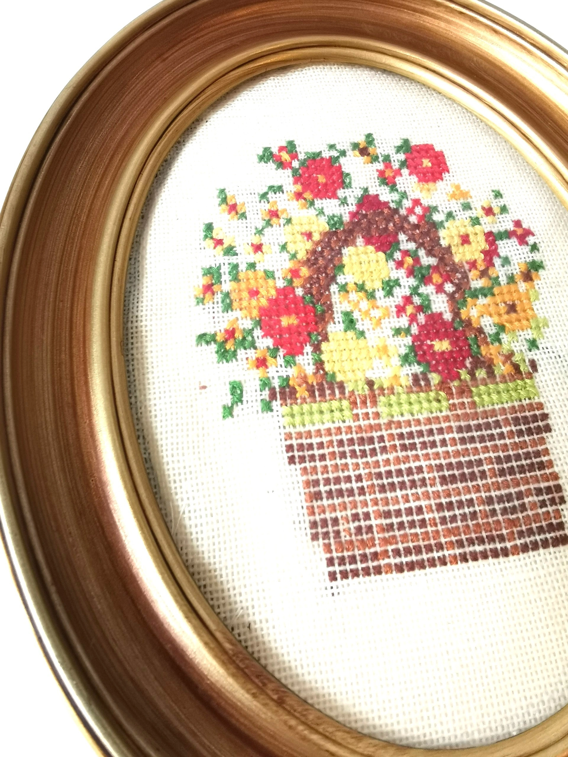 Vintage Handmade Casita Needlepoint - Floral Basket in Oval Frame