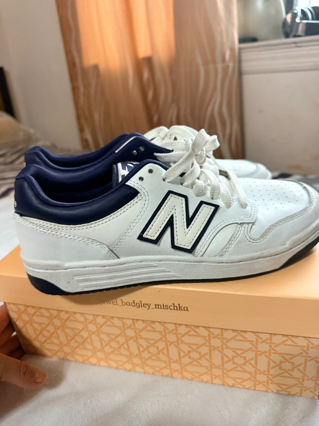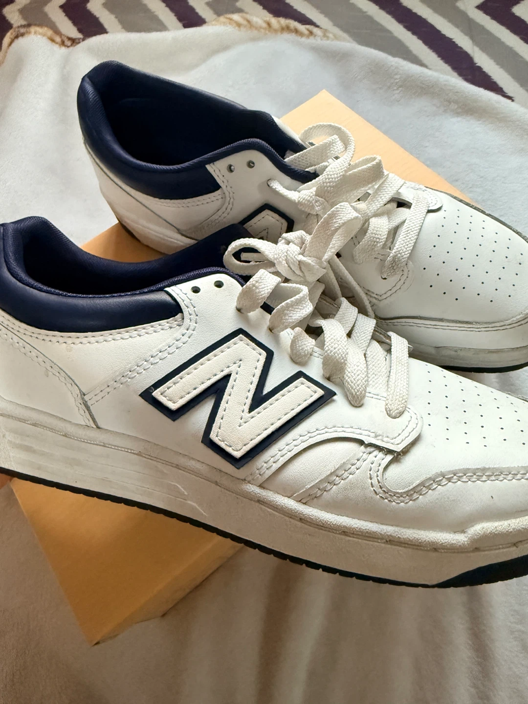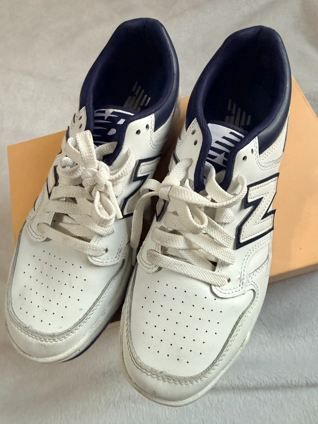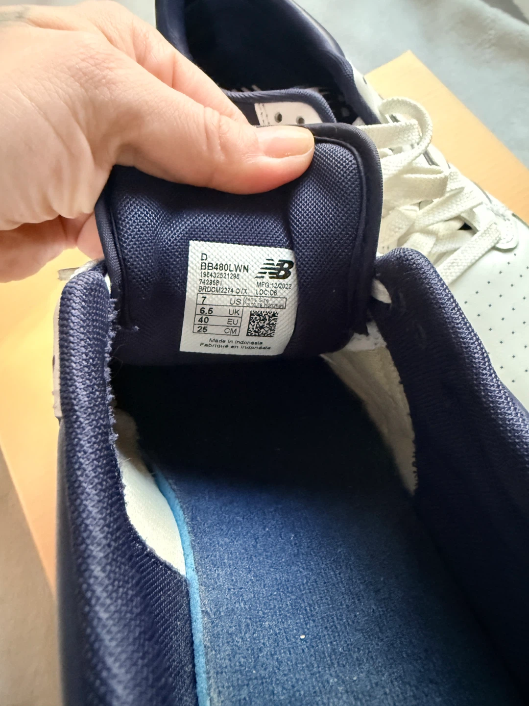 New Balance BB480LWN sneakers in a size 7. These are white with navy blue accents. The manufacturing date is December 2022. / one time used . No box