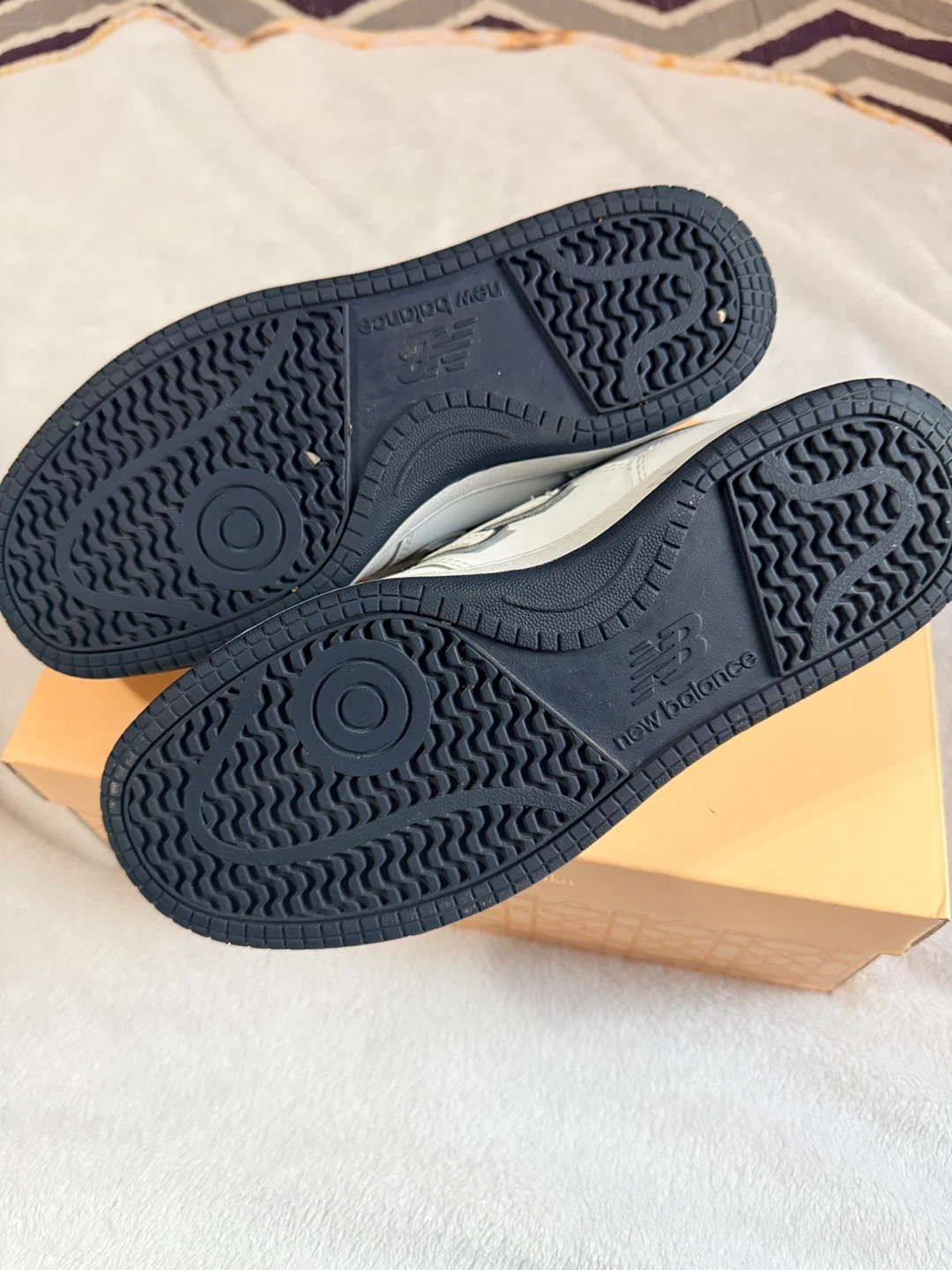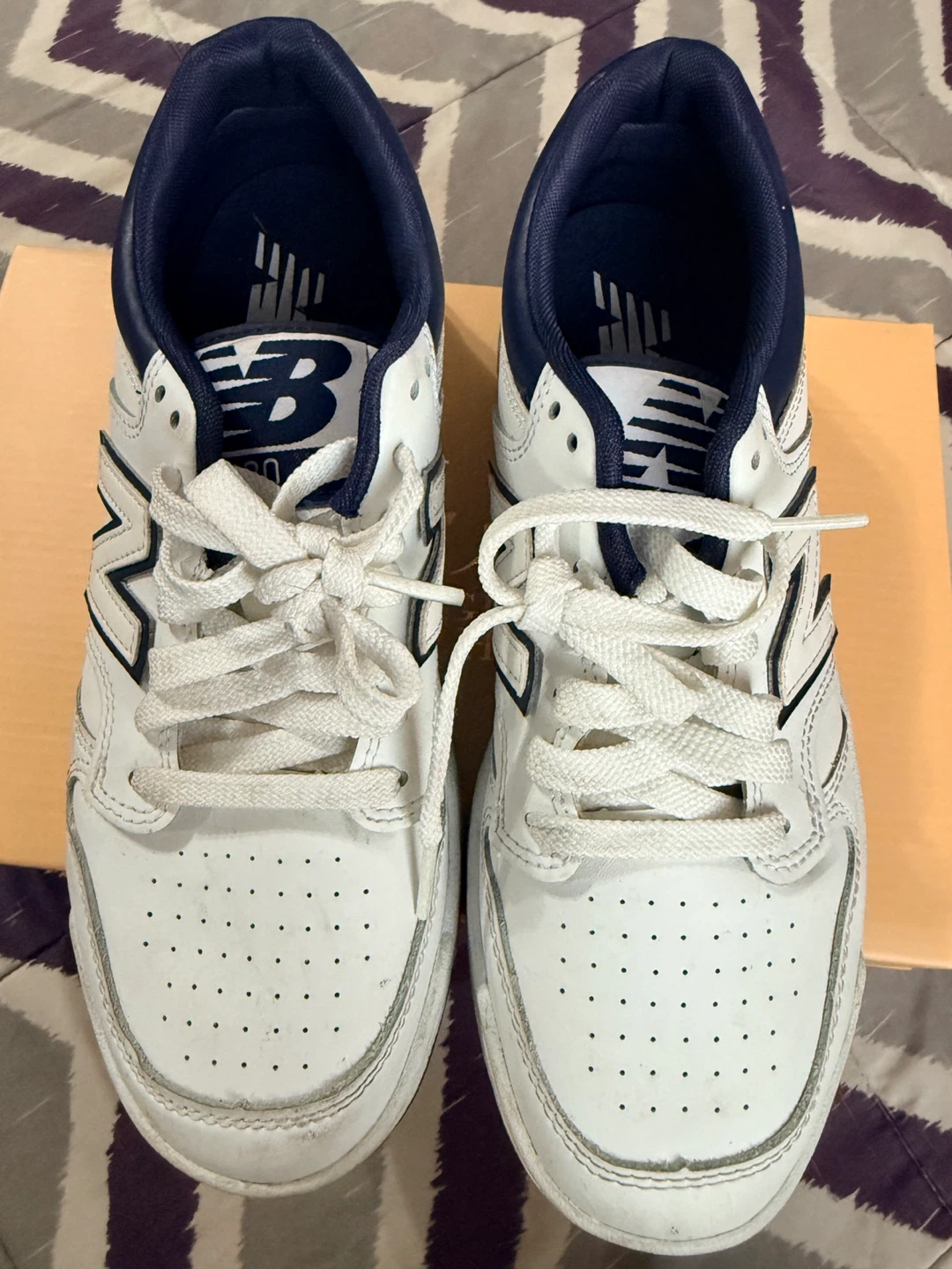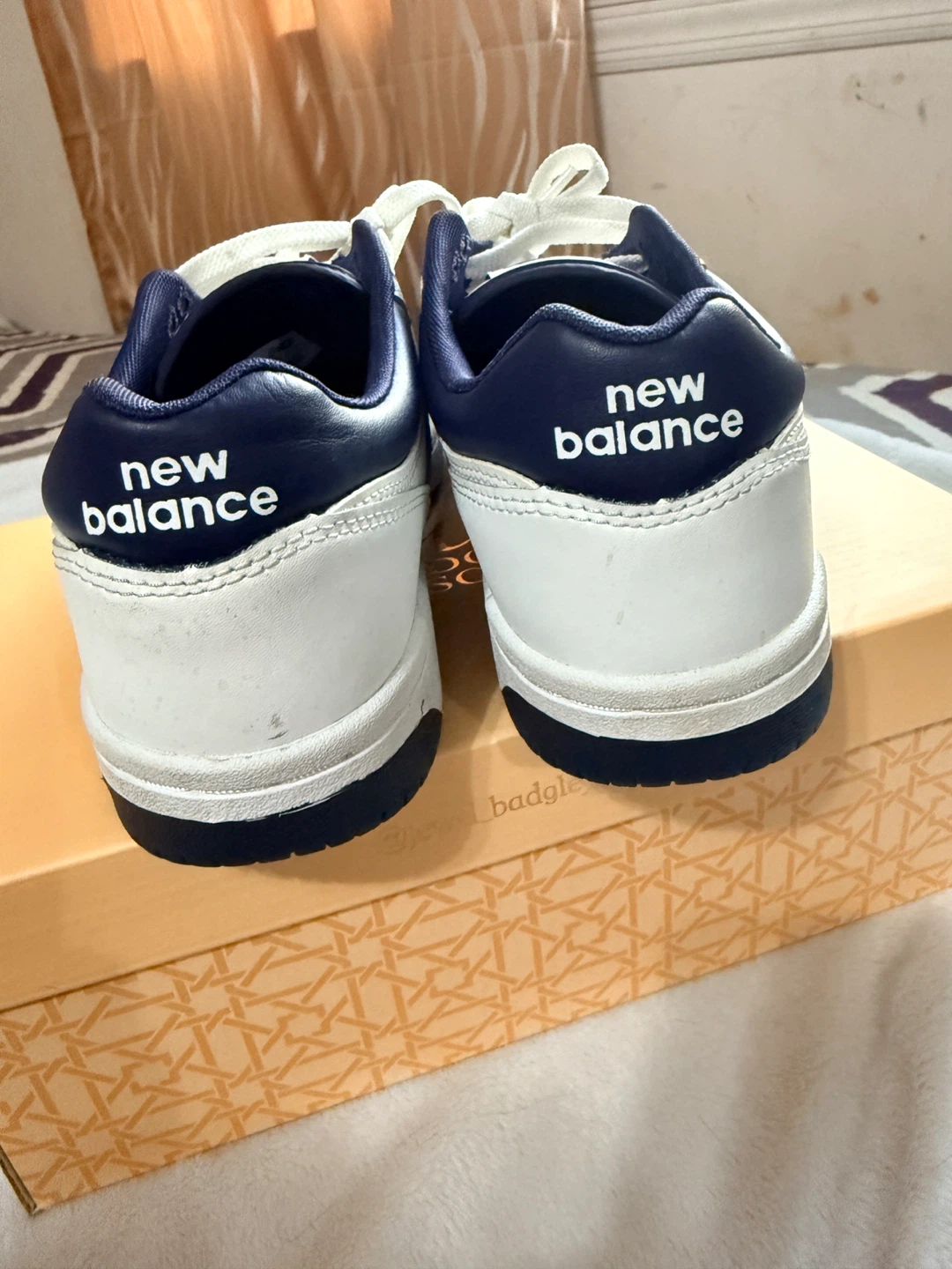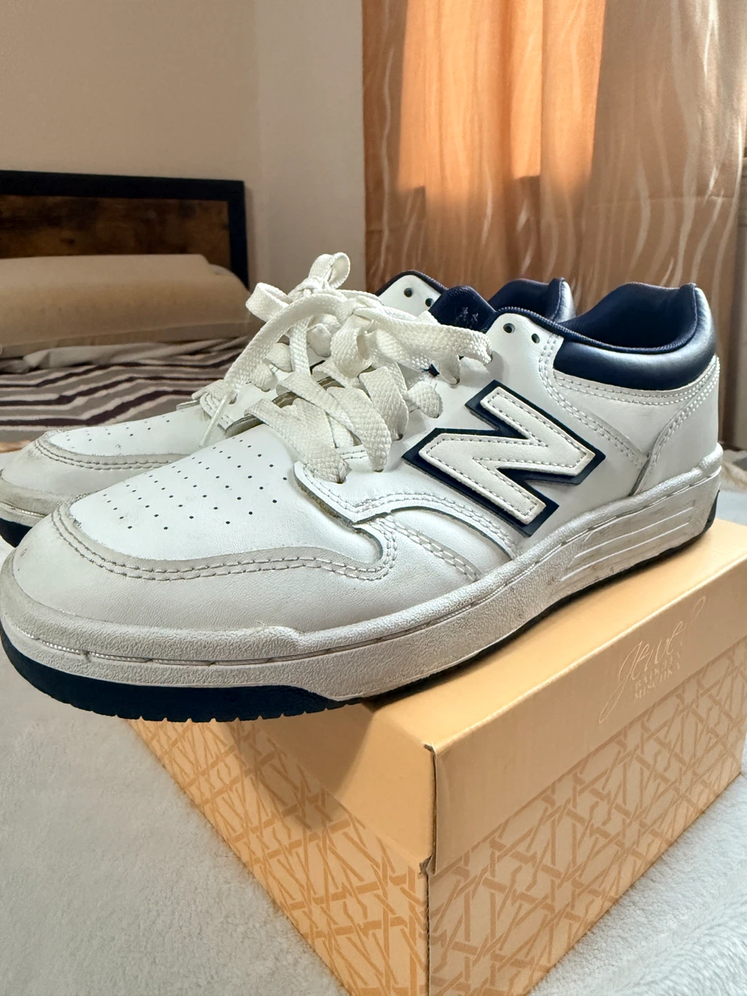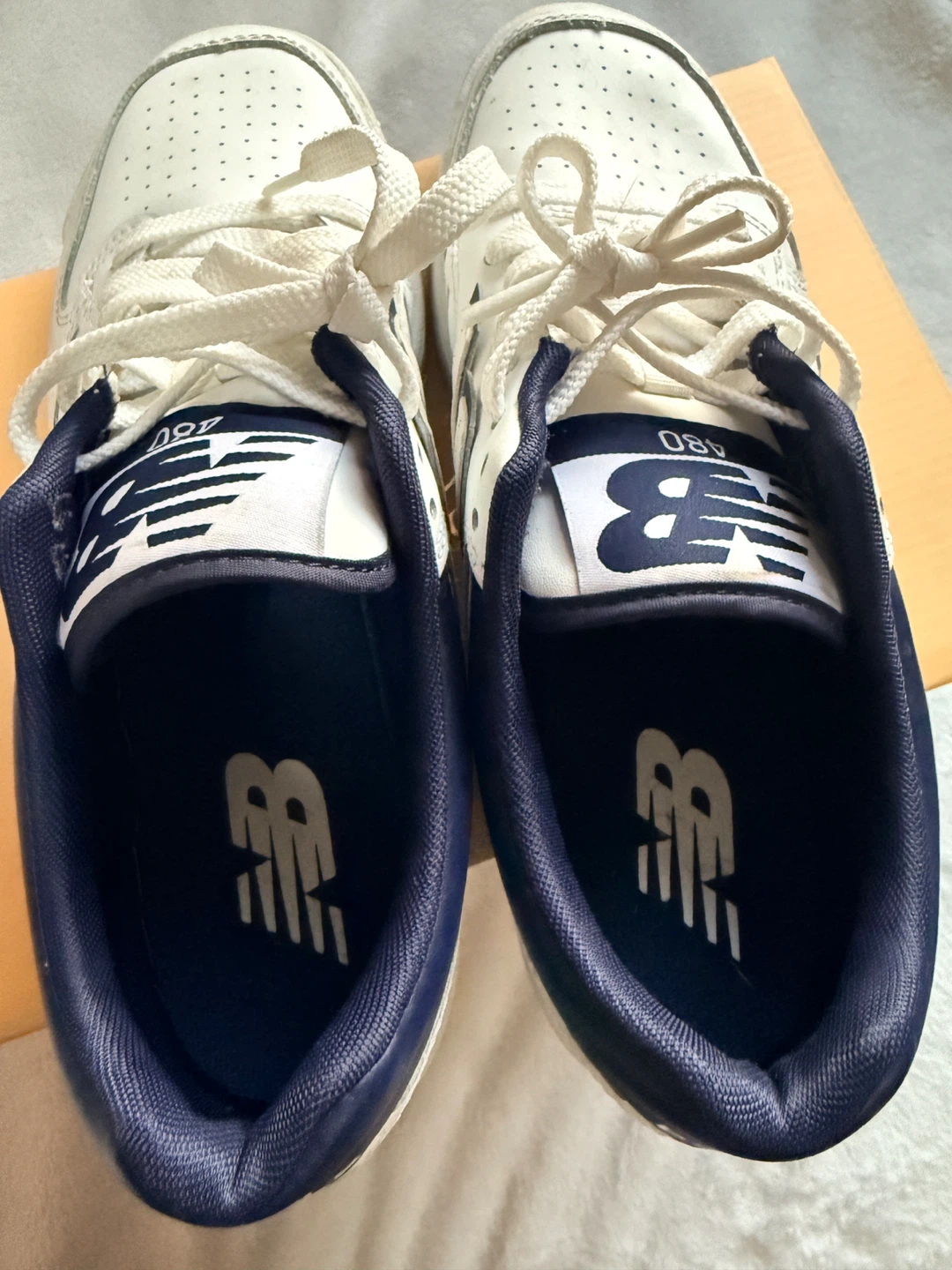 New Balance BB480LWN sneakers in a size 7. These are white with navy blue accents. The manufacturing date is December 2022. / one time used . No box